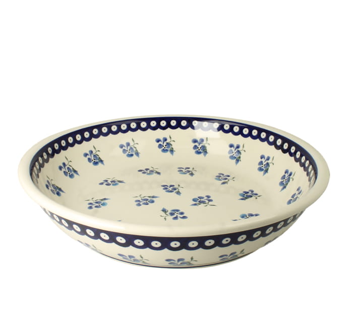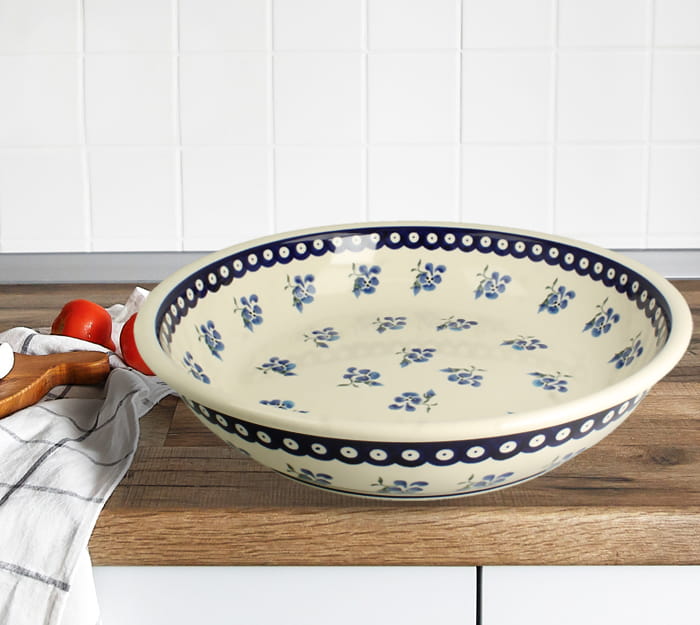 Big, shallow bowl, diameter 33,2 cm. Can be used for serving salad, fruits or for products storage. Made of natural ceramic clays, hand formed and hand decorated by Bolesławiec artist. Dishwasher and microwave safe.