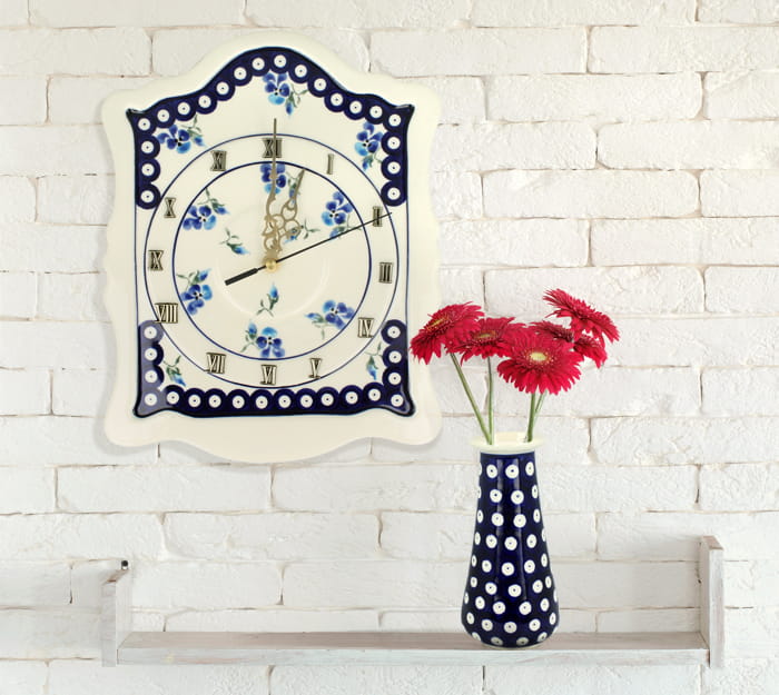 Ceramic clock with functional and decorative face, dimensions 22,3 x 29,7 cm. Can be wall mounted or supported by the stand. Made of natural ceramic clays, hand formed and hand decorated by Bolesławiec artist.