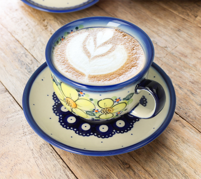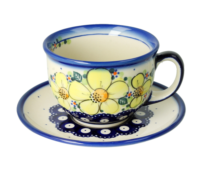 Cup 0,22 and saucer 16cm. Perfect for tea or coffee. Product made from ceramic clay, hand-made and hand-painted in Zakłady Ceramiczne Bolesławiec.