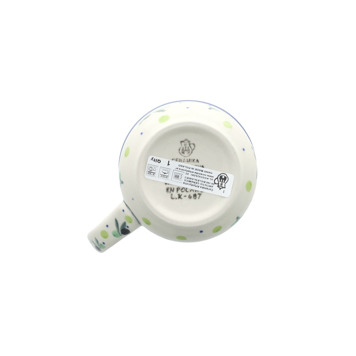 Ceramiczny, ręcznie malowany kubek o pojemności 0,6L. Naczynie pochodzi z zakładów ceramicznych w Bolesławcu – Galia. Kubek jest postawny, mierzy 13cm wysokości.
