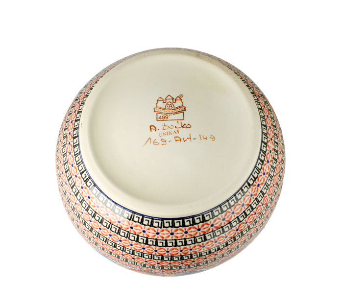 Warmer of diameter 13,9 cm from artistic decoration no.149Art. Product made from ceramic clay, hand-made and hand-painted in Zakłady Ceramiczne Bolesławiec. Warmers from artistic decorations are hand-painted and signed by the artist on the bottom.