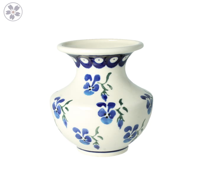 Big and round vase with wide rim, height 10,2 cm. Decorative vessel for dried and fresh flowers. Made of natural ceramic clays, hand formed and hand decorated by Bolesławiec artist. Dishwasher and microwave safe.