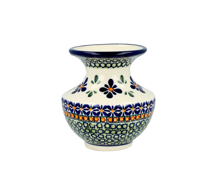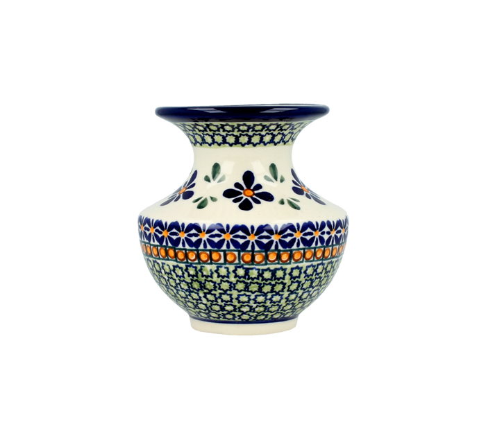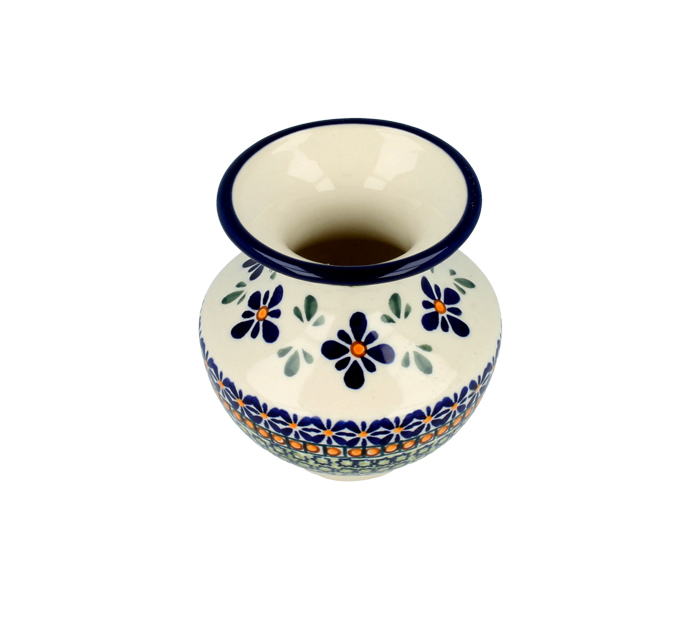 Vase with wide rim, height 11,1 cm. Decorative vessel for dried and fresh flowers. Made of natural ceramic clays, hand formed and hand decorated by Bolesławiec artist. Dishwasher and microwave safe.