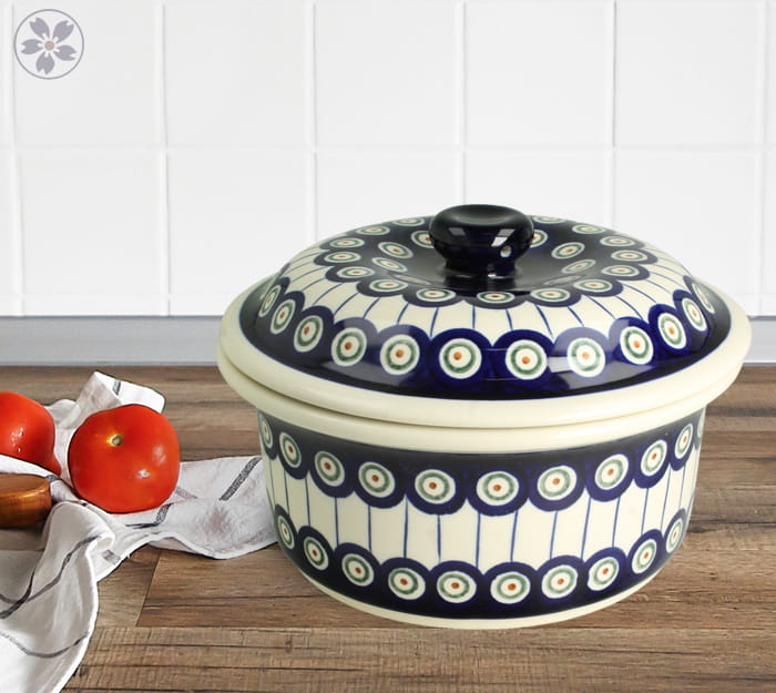 Owalna brytfanna z pokrywą, z możliwością podgrzewania i zapiekania. Produkt ręcznie formowany i dekorowany w Zakładach Ceramicznych Bolesławiec.