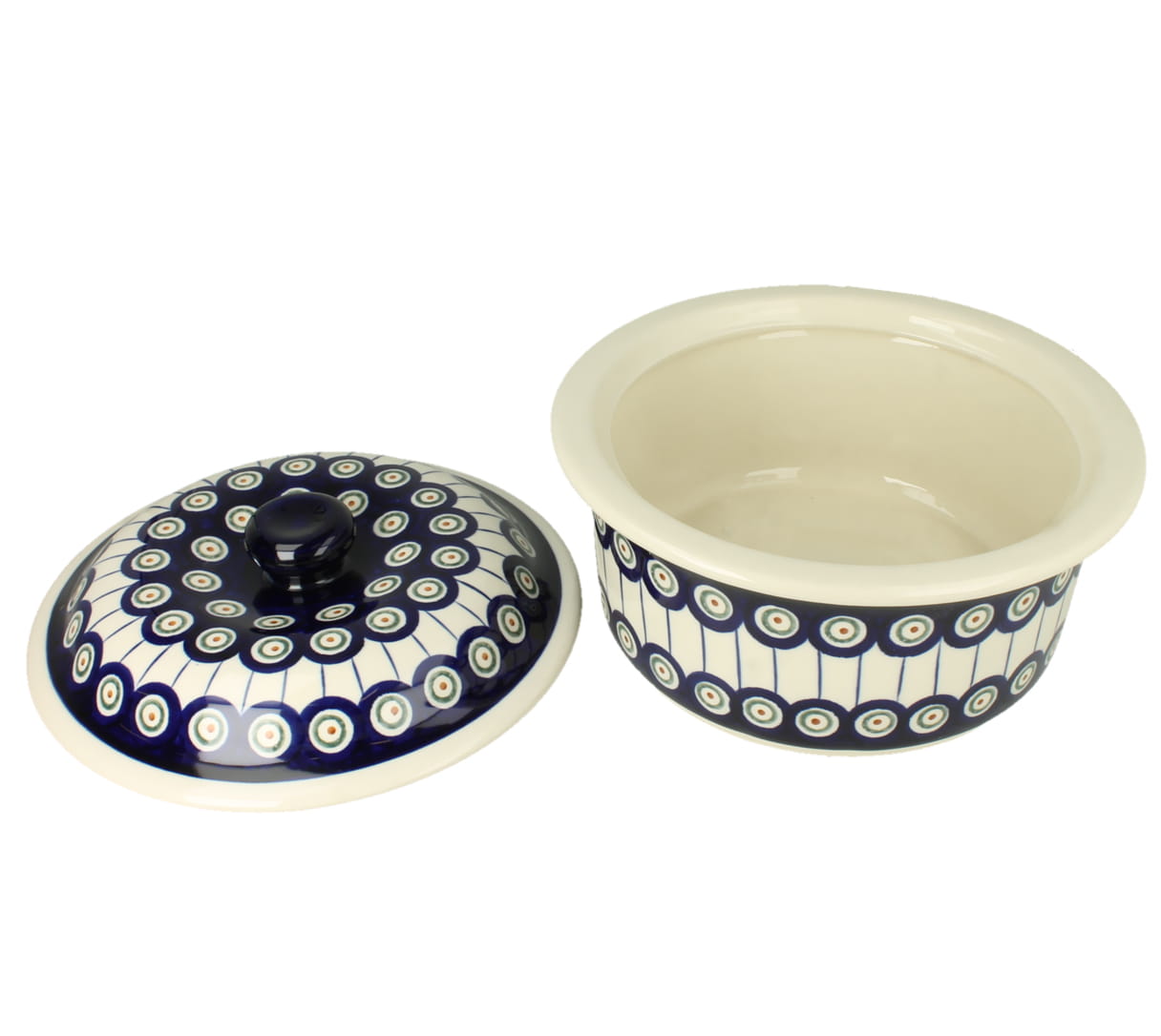 Okrągła cukiernica z otworem na łyżeczkę w pokrywce. Produkt ręcznie formowany i dekorowany w Zakładach Ceramicznych Bolesławiec.