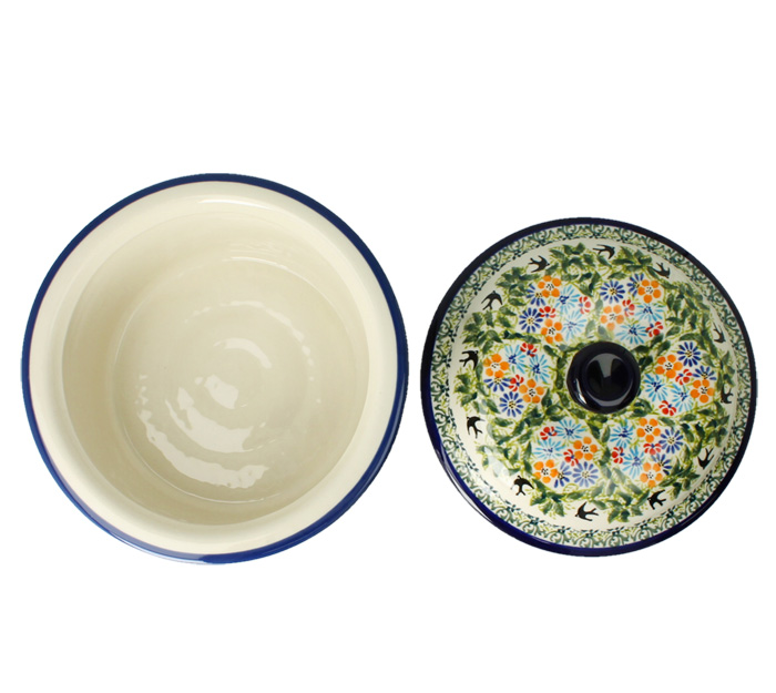Mała, okrągła cukiernica z otworem na łyżeczkę. Produkt ręcznie formowany i dekorowany w Zakładach Ceramicznych Bolesławiec.