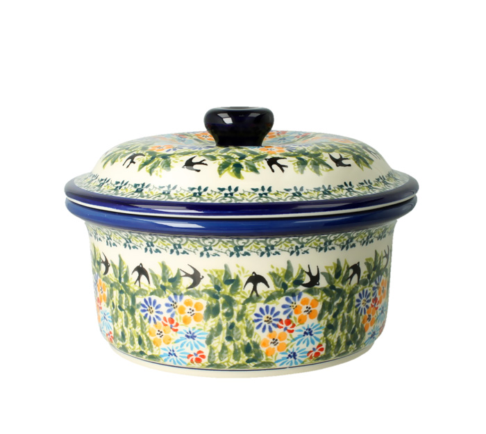 Owalna brytfanna z pokrywą, z możliwością podgrzewania i zapiekania. Produkt ręcznie formowany i dekorowany w Zakładach Ceramicznych Bolesławiec.
