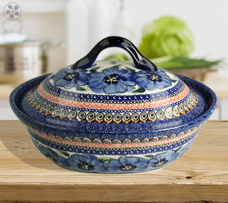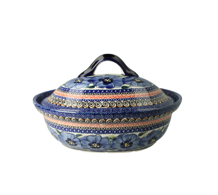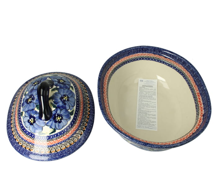 Owalna brytfanna z pokrywą, z możliwością podgrzewania i zapiekania. Produkt ręcznie formowany i dekorowany w Zakładach Ceramicznych Bolesławiec.