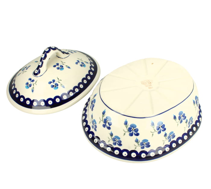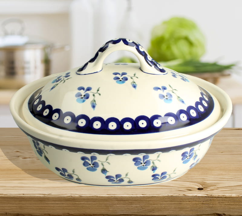 Owalna brytfanna z pokrywą, z możliwością podgrzewania i zapiekania. Produkt ręcznie formowany i dekorowany w Zakładach Ceramicznych Bolesławiec.