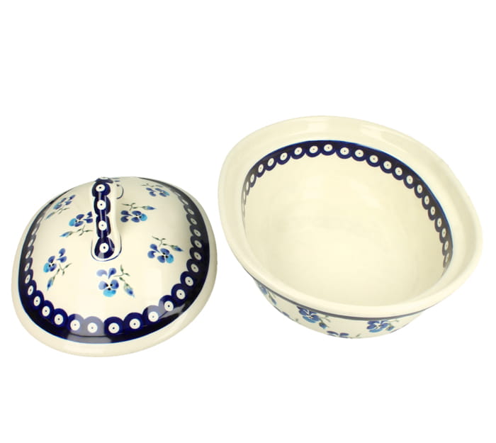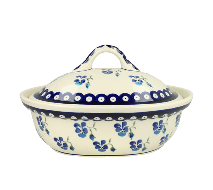 Maselnica z pokrywką, pomieści pół kostki masła. Produkt ręcznie formowany i dekorowany w Zakładach Ceramicznych Bolesławiec.