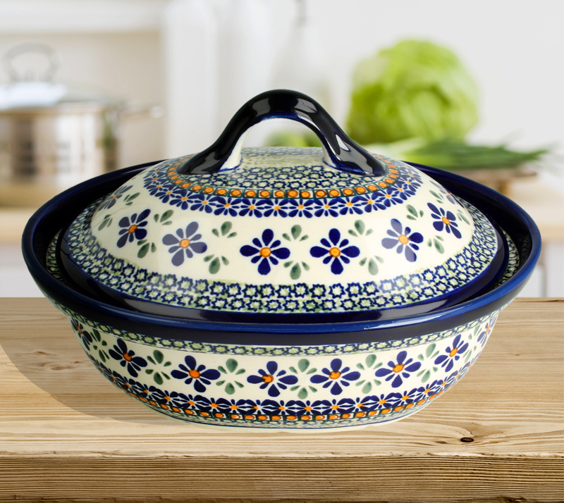 Owalna brytfanna z pokrywą, z możliwością podgrzewania i zapiekania. Produkt ręcznie formowany i dekorowany w Zakładach Ceramicznych Bolesławiec.