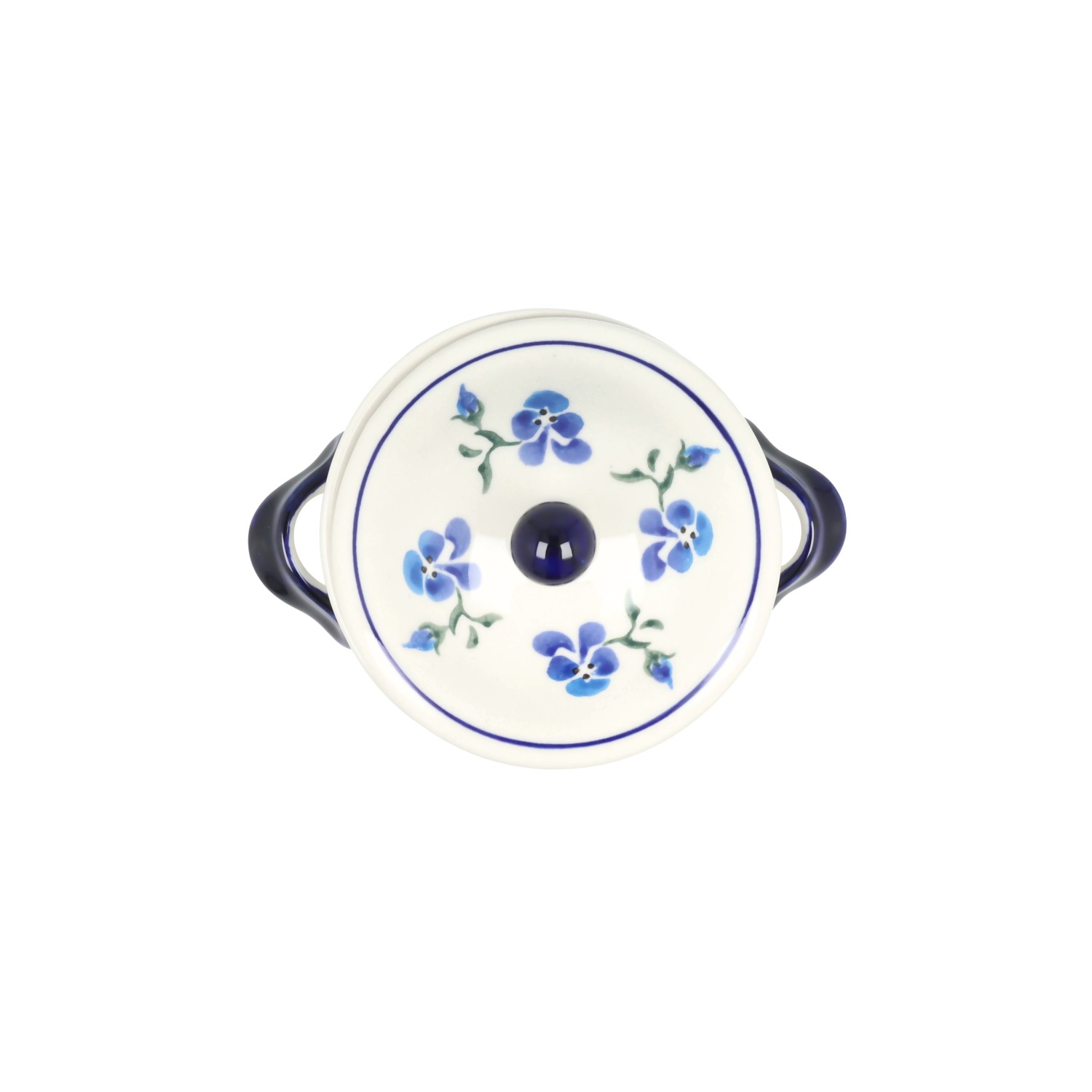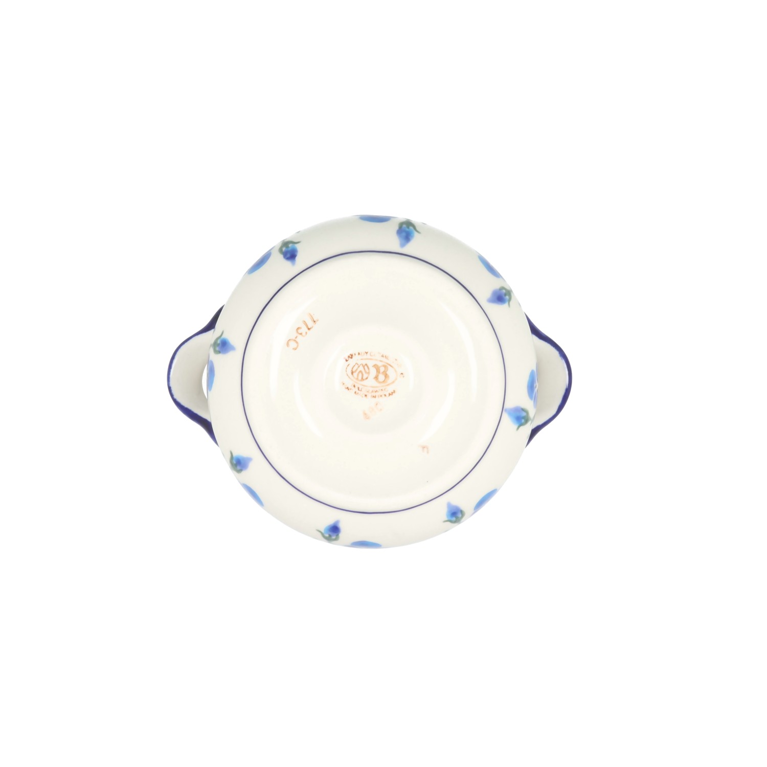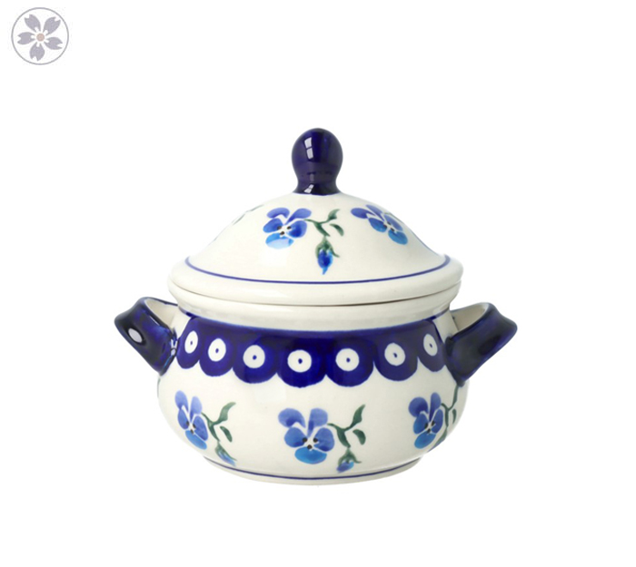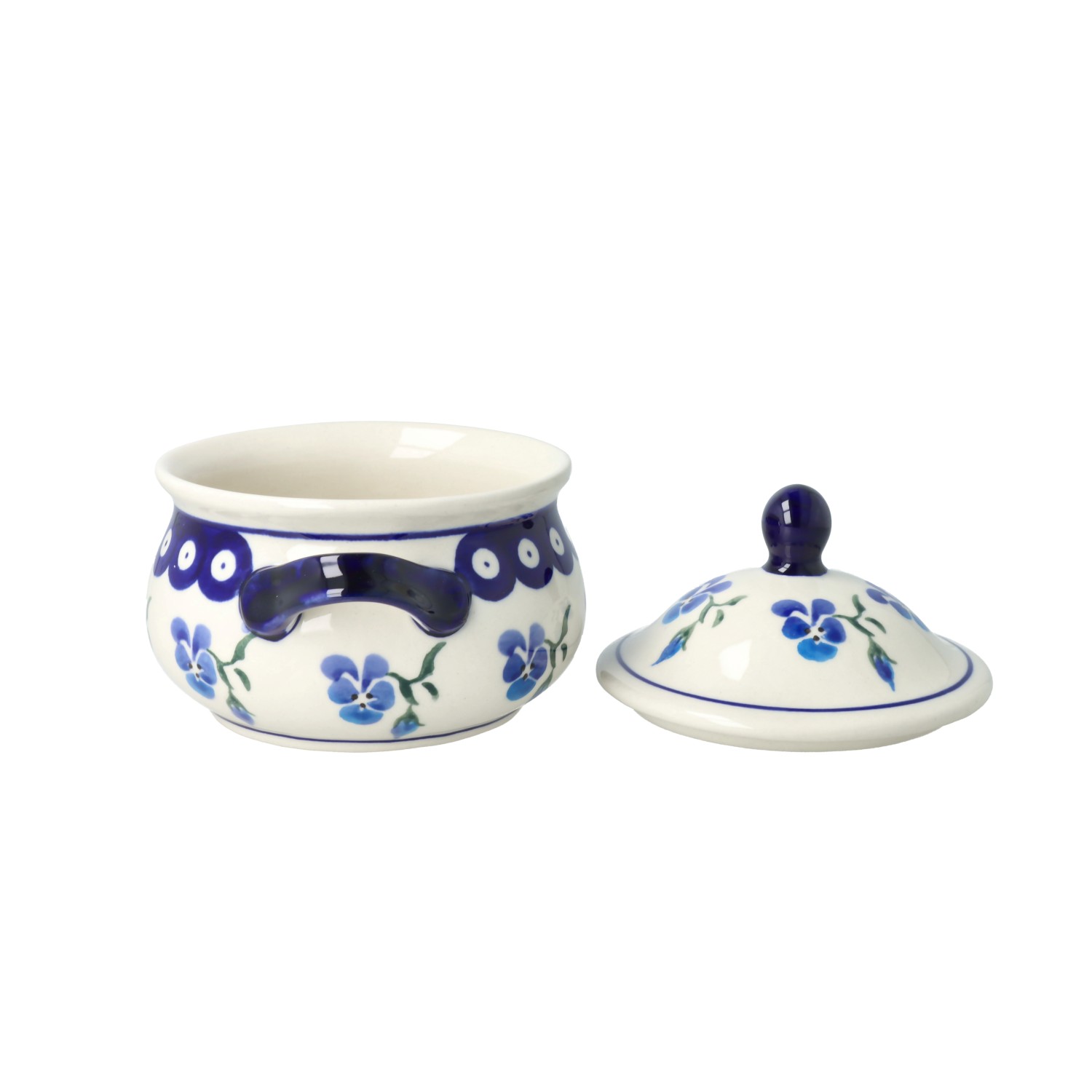 Okrągła cukiernica z otworem na łyżeczkę. Produkt ręcznie formowany i dekorowany w Zakładach Ceramicznych Bolesławiec.