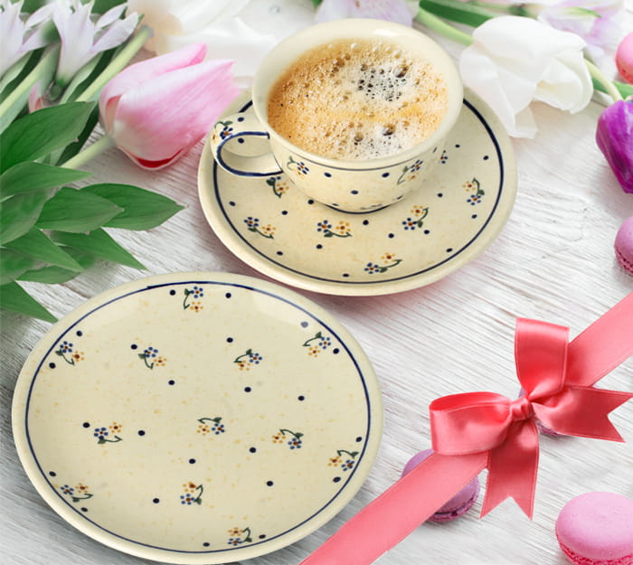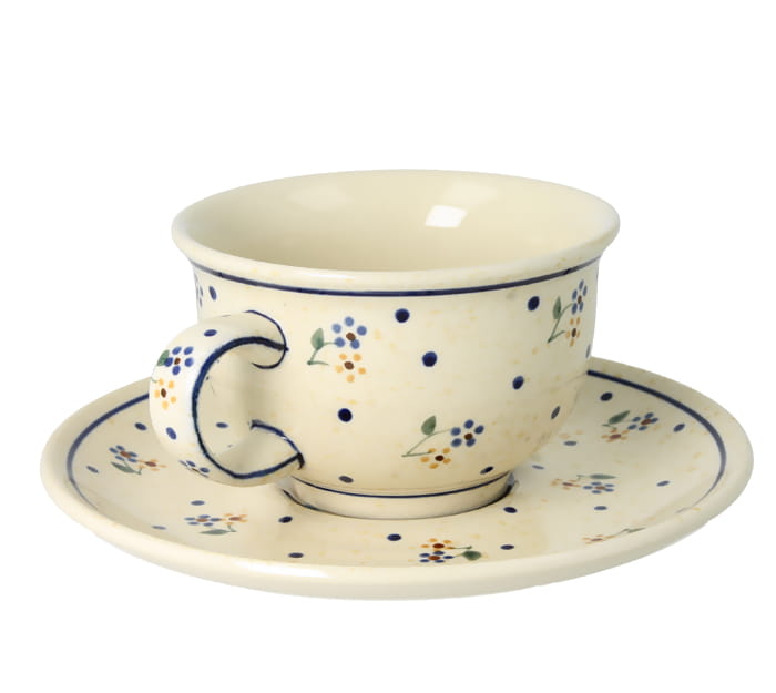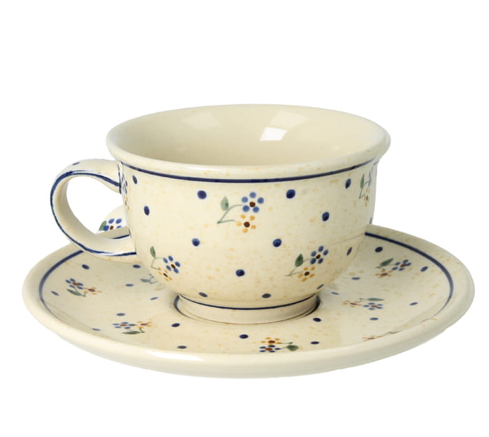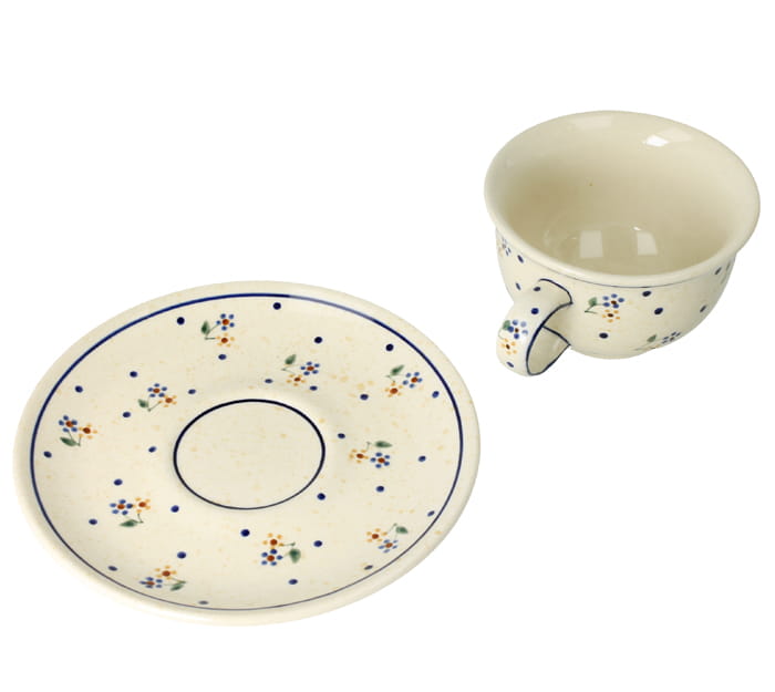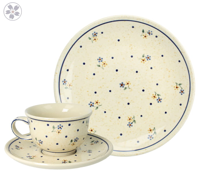 Zestaw składający się z filiżanki ze spodkiem i talerzem śniadaniowym. Produkt ręcznie formowany i dekorowany w Zakładach Ceramicznych Bolesławiec.