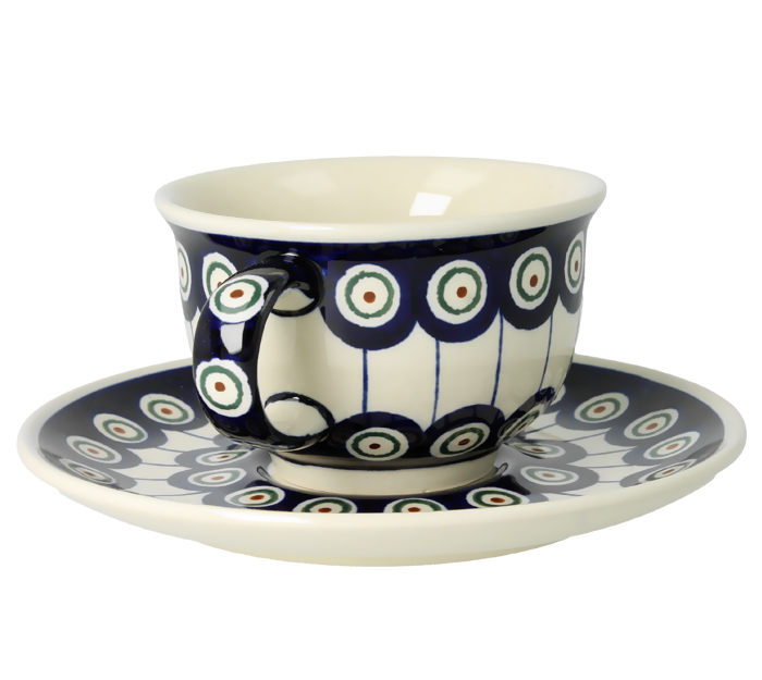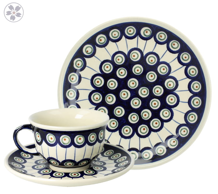 Zestaw składający się z filiżanki ze spodkiem i talerza śniadaniowego. Produkt ręcznie formowany i dekorowany w Zakładach Ceramicznych Bolesławiec.