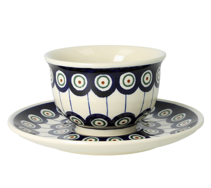 Zestaw składający się z kubka i talerza deserowego. Produkt ręcznie formowany i dekorowany w Zakładach Ceramicznych Bolesławiec.