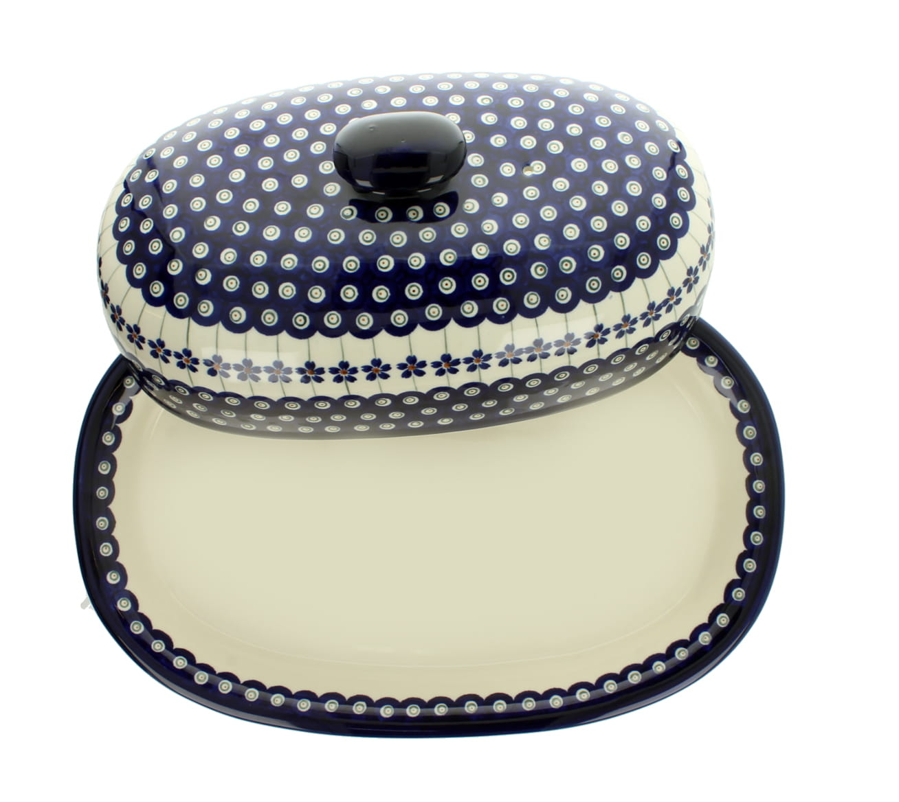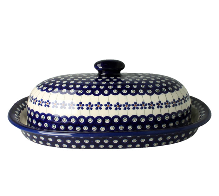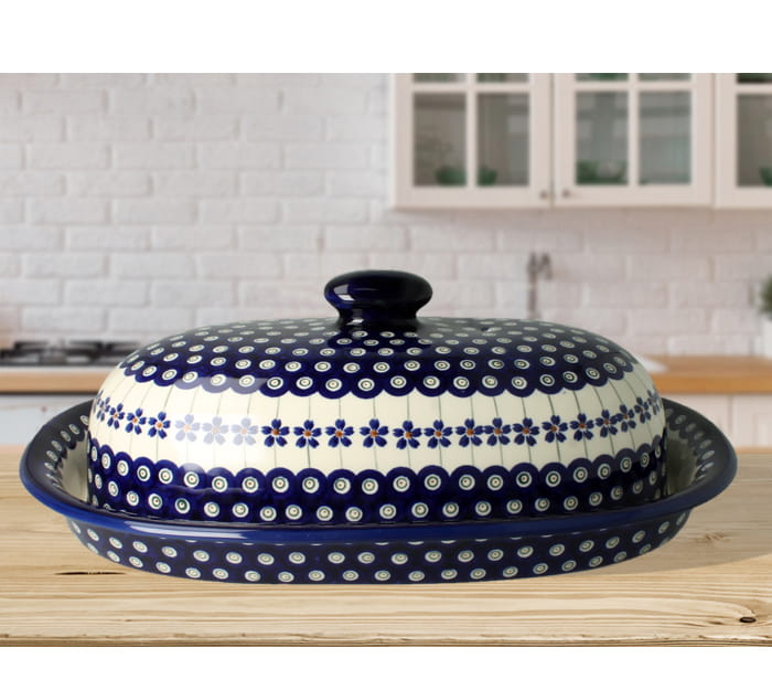 Duża maselnica z pokrywką, pomieści całą kostkę masła. Produkt ręcznie formowany i dekorowany w Zakładach Ceramicznych Bolesławiec.