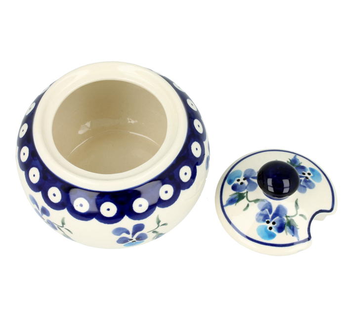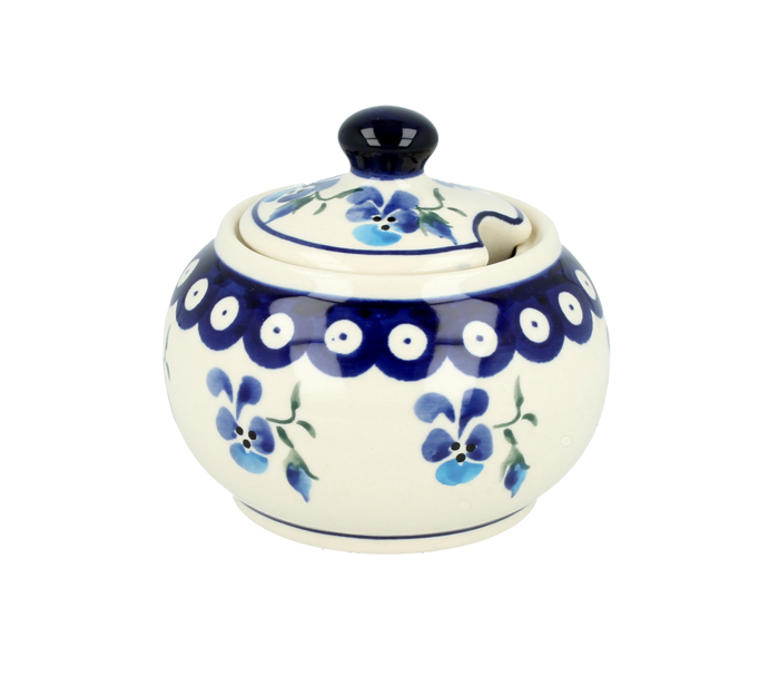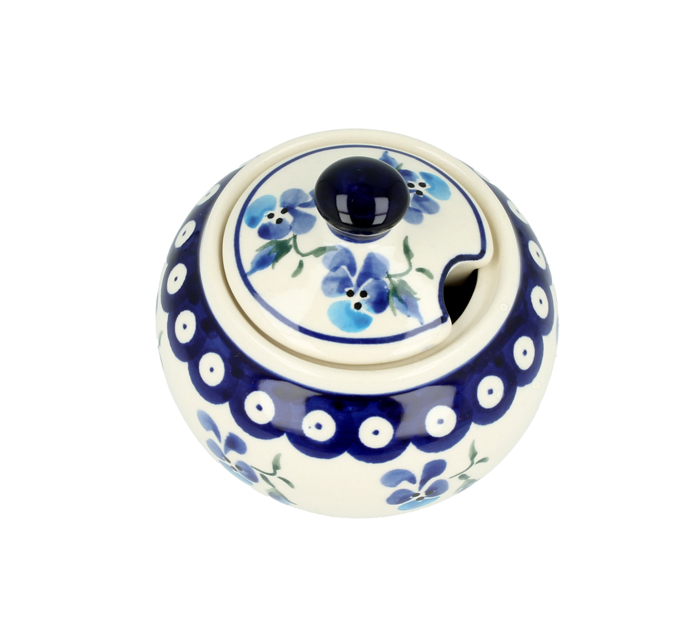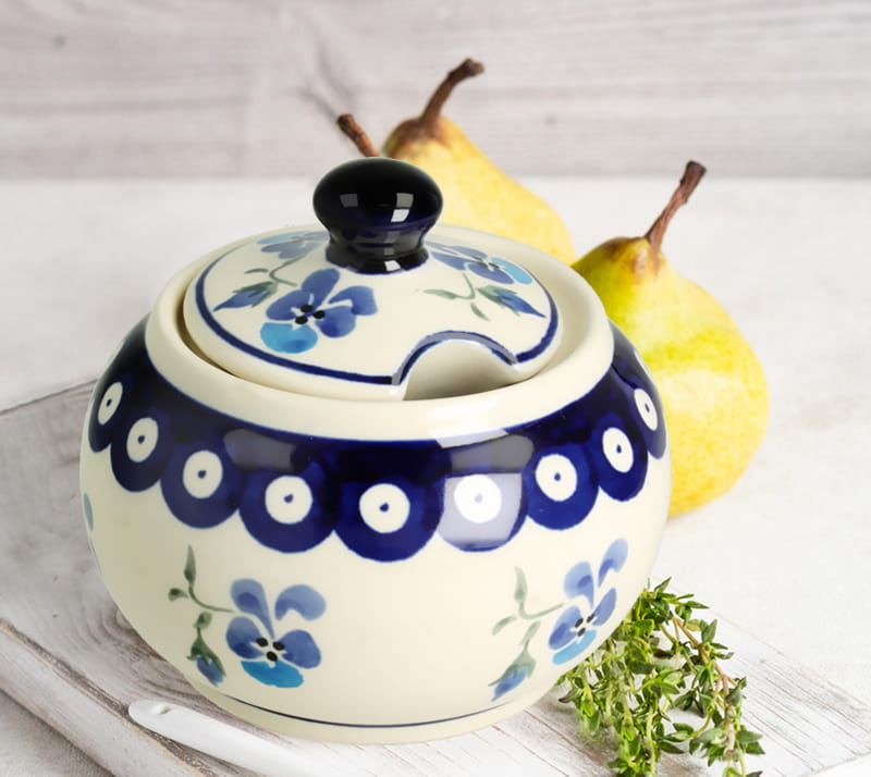 Okrągła cukiernica z otworem na łyżeczkę w pokrywce. Produkt ręcznie formowany i dekorowany w Zakładach Ceramicznych Bolesławiec.