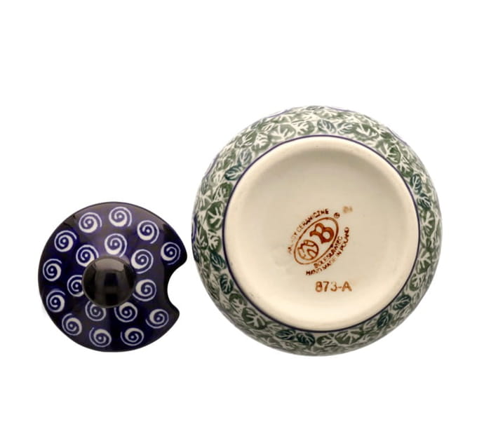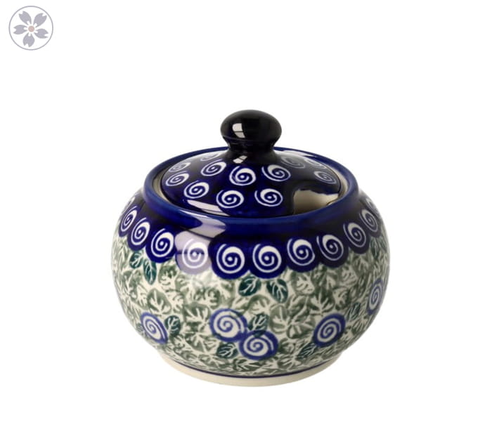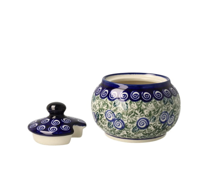 Mała, okrągła cukiernica z otworem na łyżeczkę. Produkt ręcznie formowany i dekorowany w Zakładach Ceramicznych Bolesławiec.
