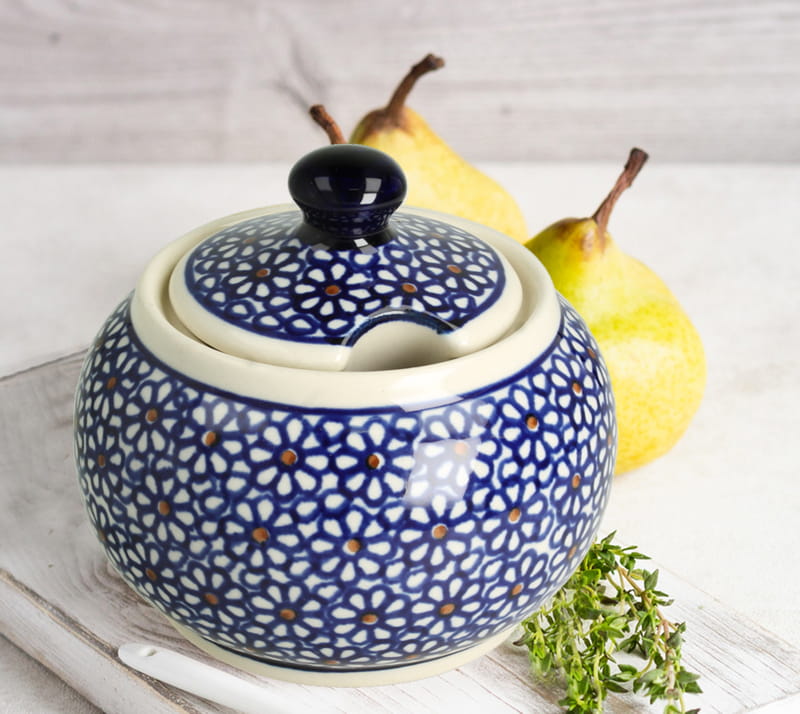 Okrągła cukiernica z otworem na łyżeczkę w pokrywie. Produkt ręcznie formowany i dekorowany w Zakładach Ceramicznych Bolesławiec.