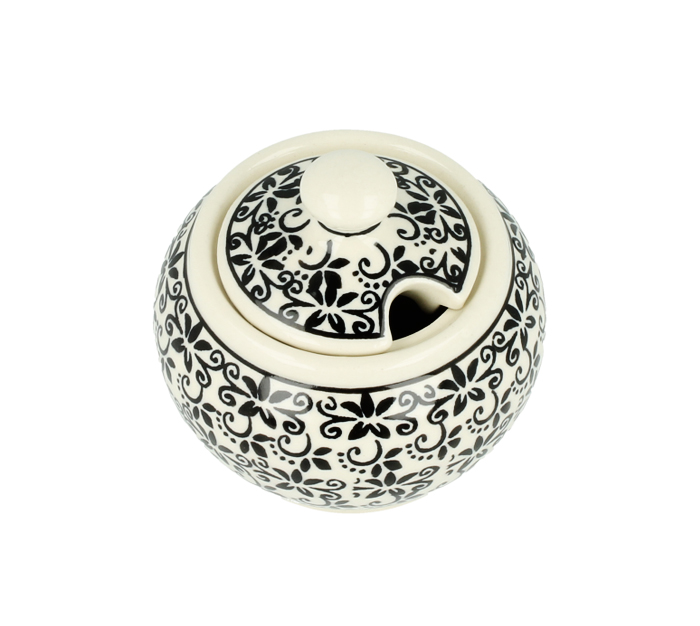 Okrągła cukiernica z otworem na łyżeczkę. Produkt ręcznie formowany i dekorowany w Zakładach Ceramicznych Bolesławiec.