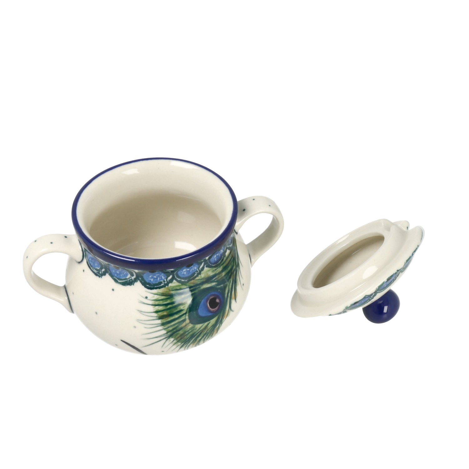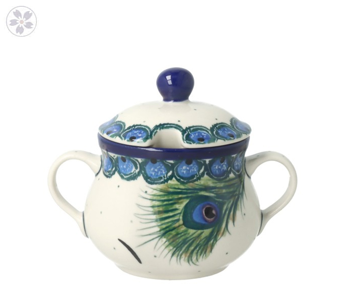 Cukiernica z dwoma uszkami. Pokrywka cukiernicy posiada otwór na łyżkę oraz wygodny uchwyt.