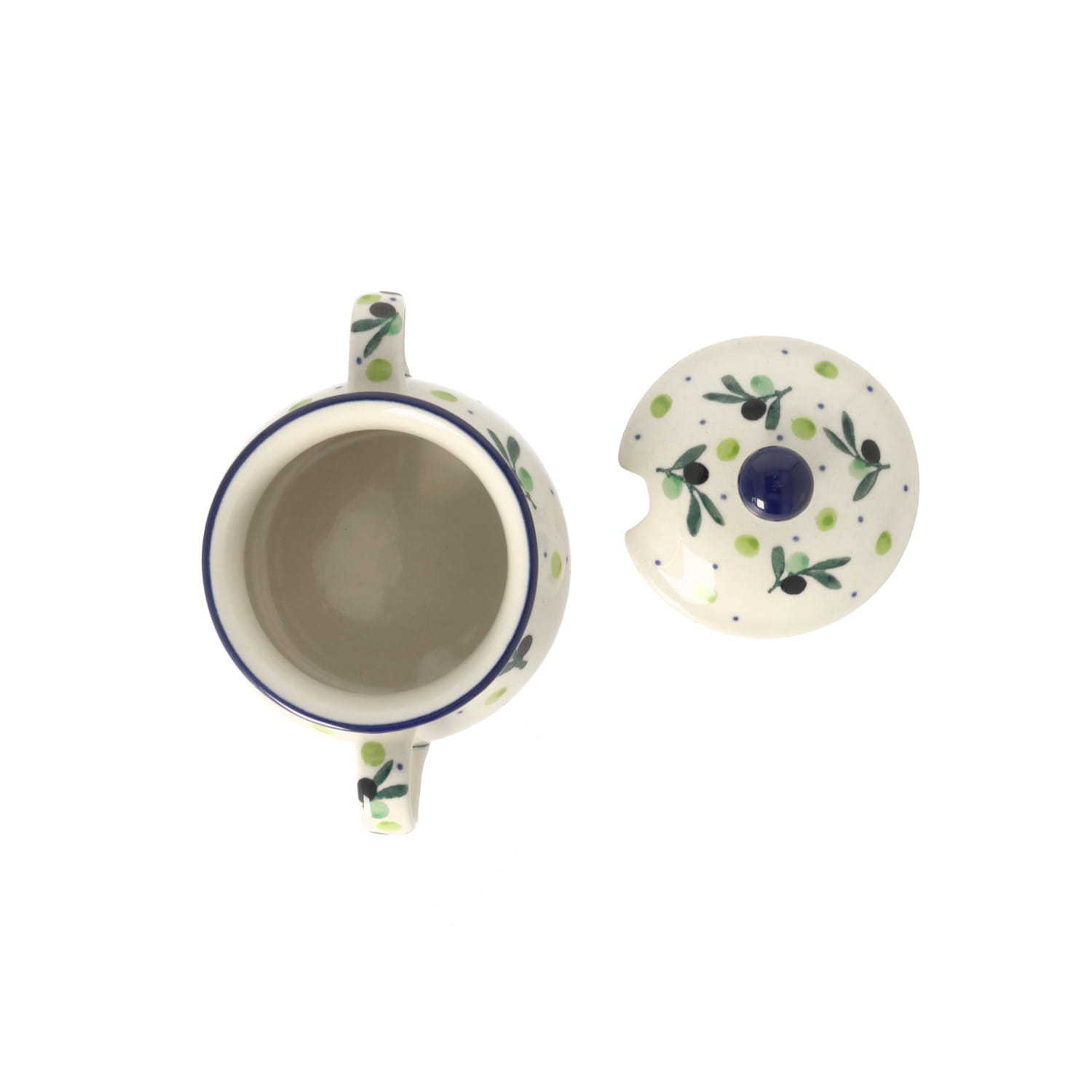 Cukiernica z dwoma uszkami. Pokrywka cukiernicy posiada otwór na łyżkę oraz wygodny uchwyt.