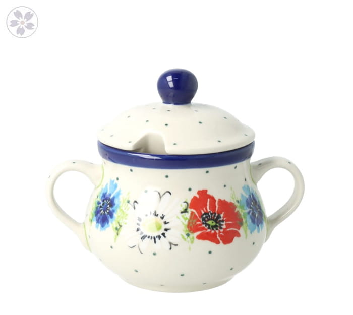 Cukiernica z dwoma uszkami. Pokrywka cukiernicy posiada otwór na łyżkę oraz wygodny uchwyt.