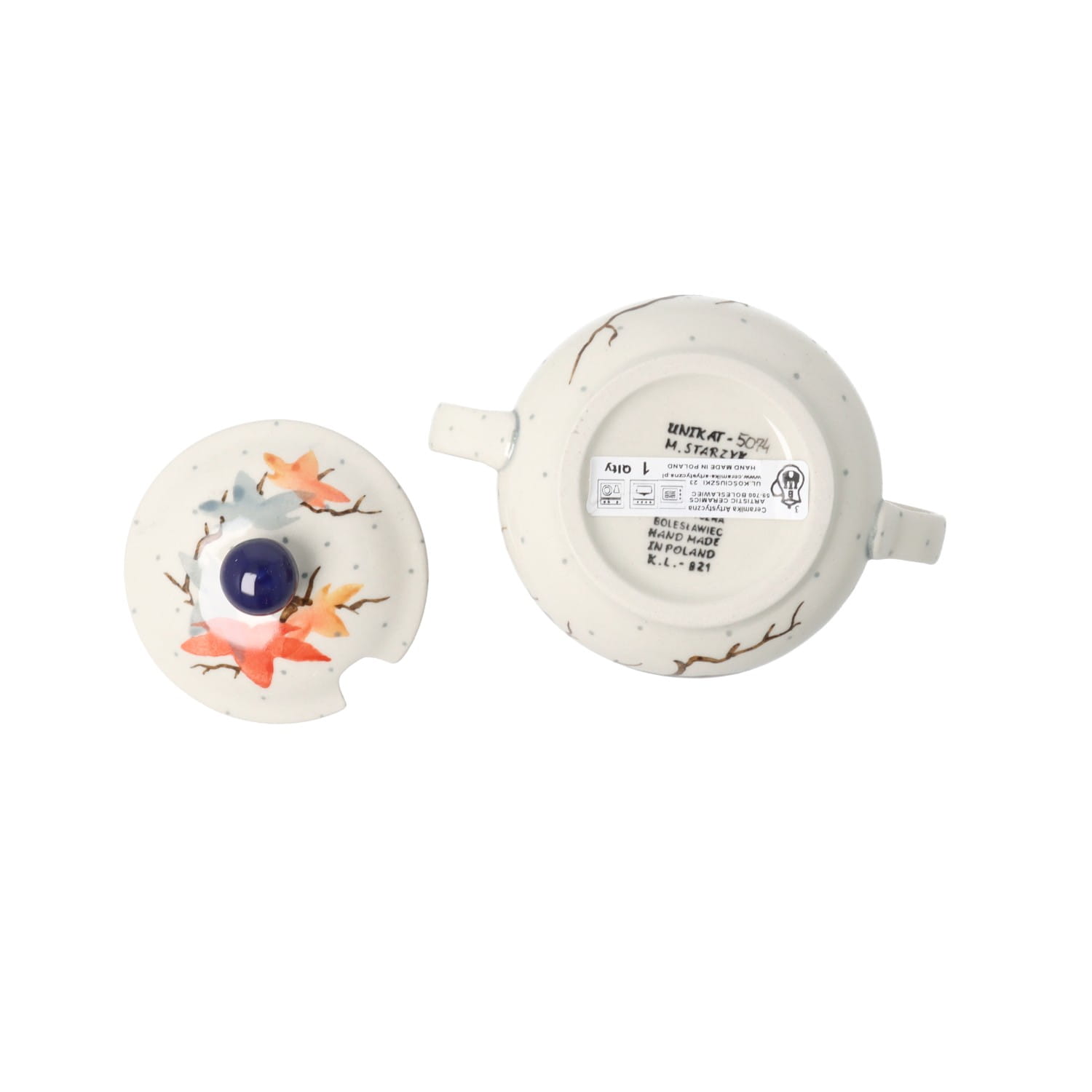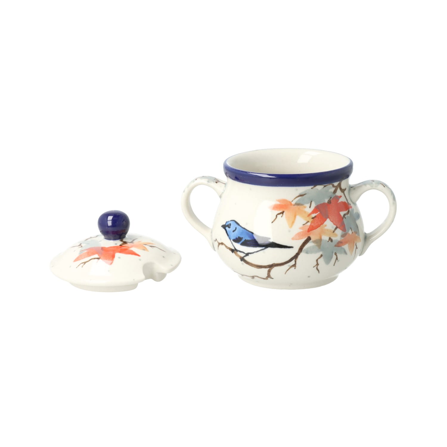 Cukiernica z dwoma uszkami. Pokrywka cukiernicy posiada otwór na łyżkę oraz wygodny uchwyt.