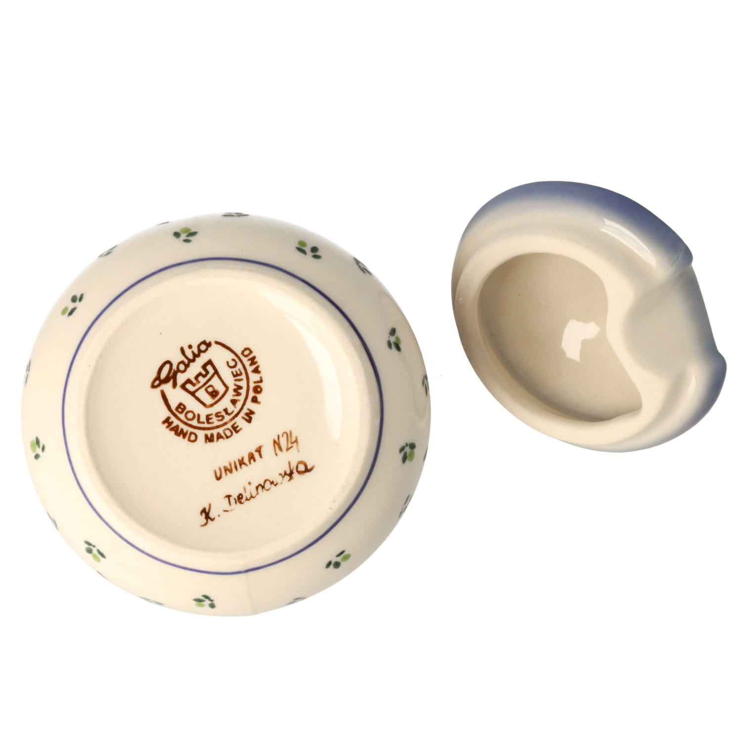 Produkt wykonany z glinki ceramicznej, ręcznie formowany i dekorowany w Manufakturze Galia w Bolesławcu.