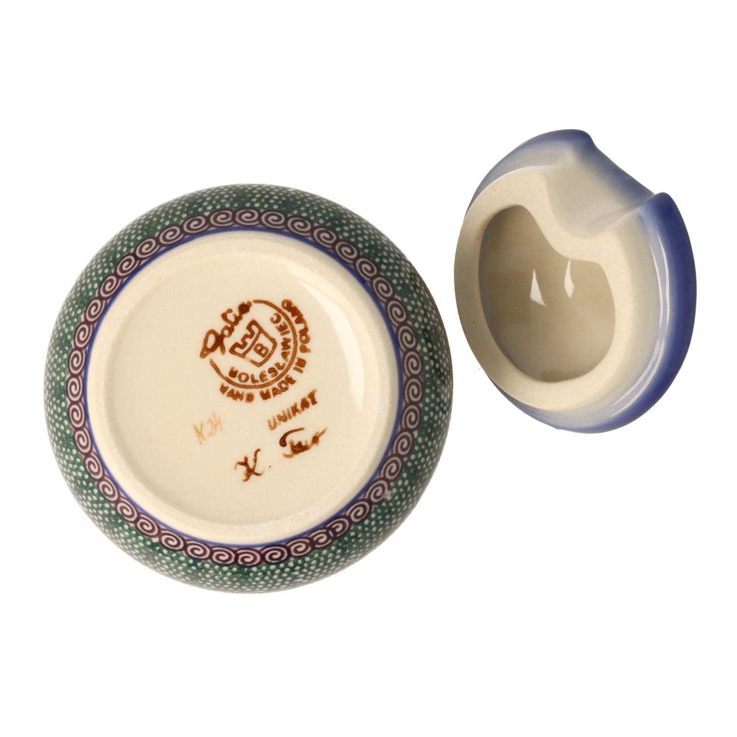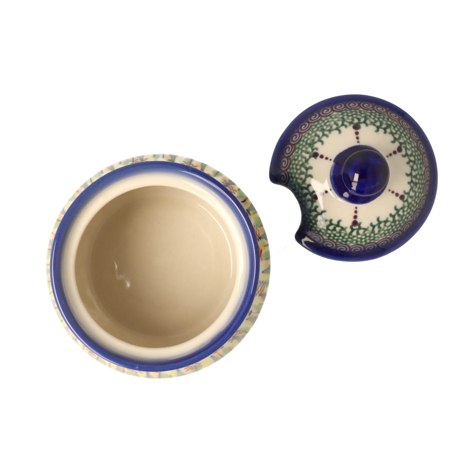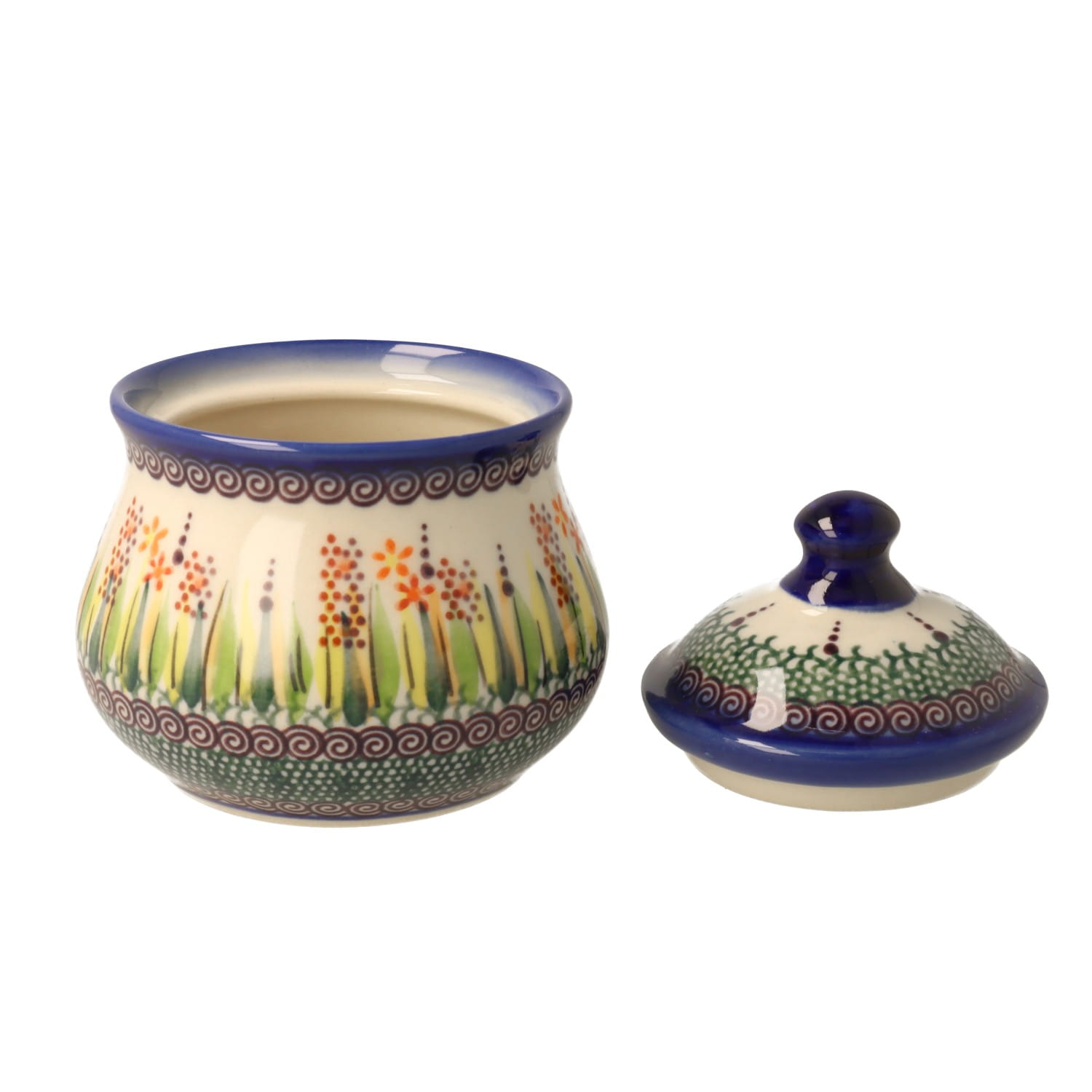 Mała, okrągła cukiernica z otworem na łyżeczkę. Produkt ręcznie formowany i dekorowany w Zakładach Ceramicznych Bolesławiec.