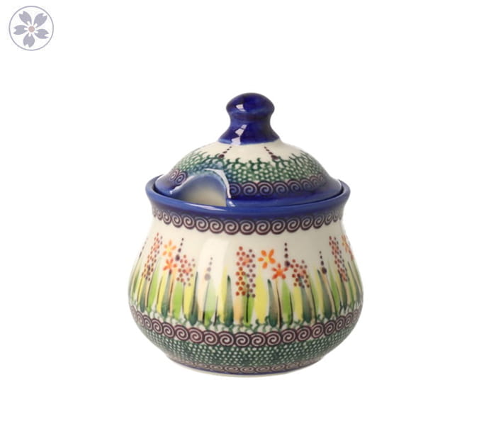 Mała cukiernica z otworem na łyżeczkę w pokrywce.. Produkt ręcznie formowany i dekorowany w Zakładach Ceramicznych Bolesławiec.