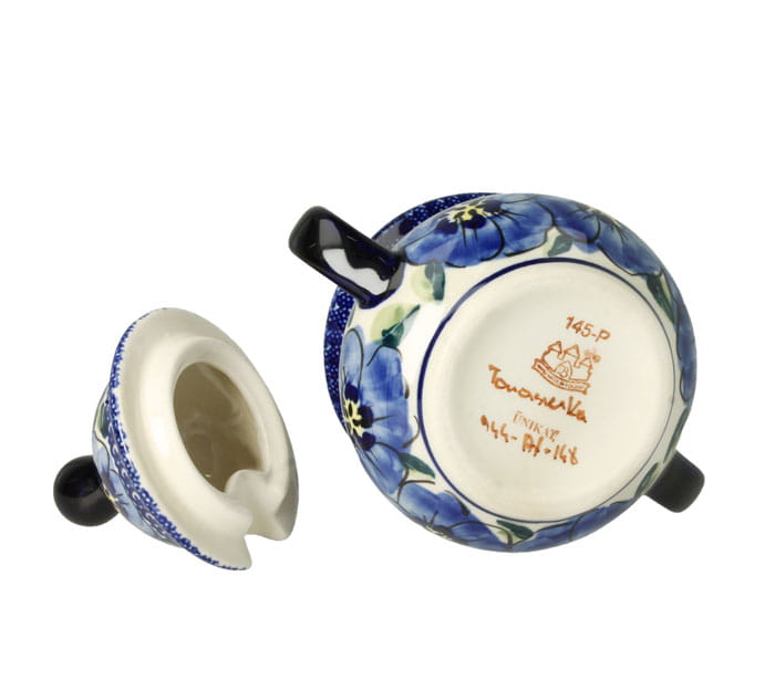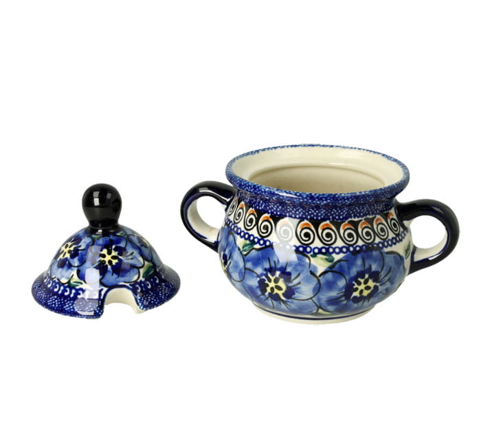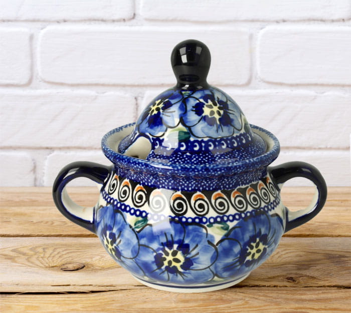 Okrągła cukiernica z otworem na łyżeczkę w pokrywie. Produkt ręcznie formowany i dekorowany w Zakładach Ceramicznych Bolesławiec.