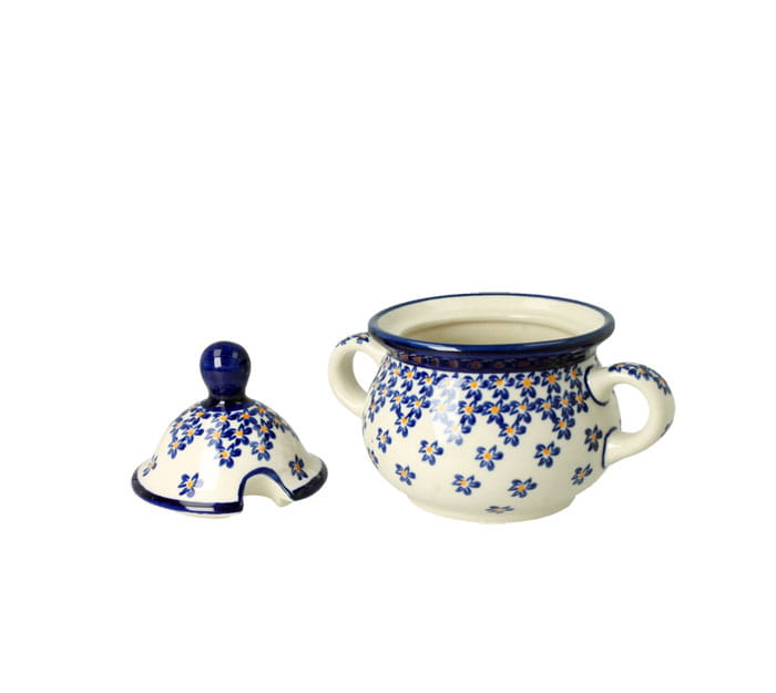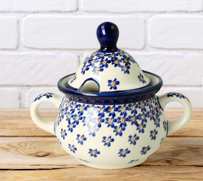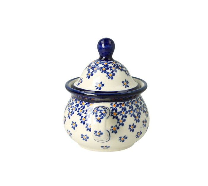 Mała, okrągła cukiernica z otworem na łyżeczkę. Produkt ręcznie formowany i dekorowany w Zakładach Ceramicznych Bolesławiec.