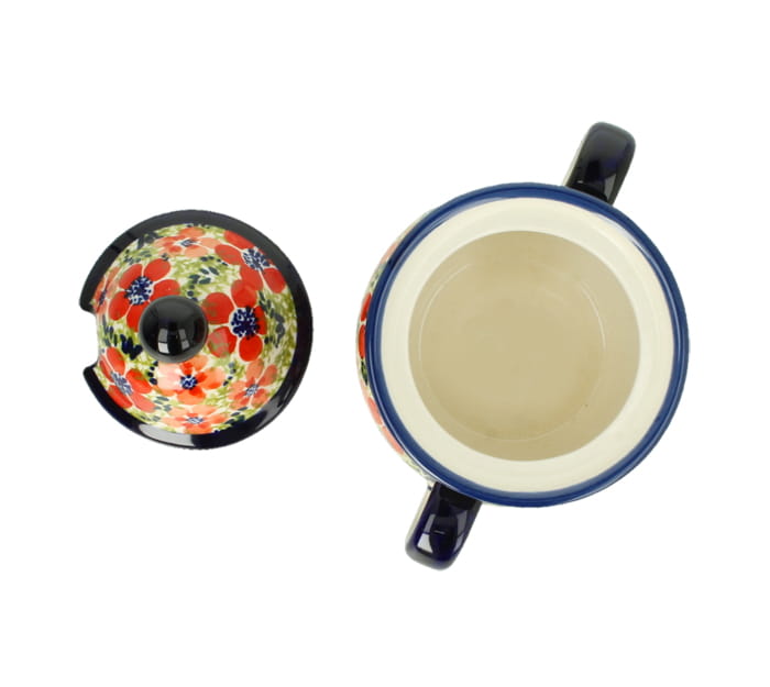 Okrągła cukiernica z otworem na łyżeczkę w pokrywce. Produkt ręcznie formowany i dekorowany w Zakładach Ceramicznych Bolesławiec.