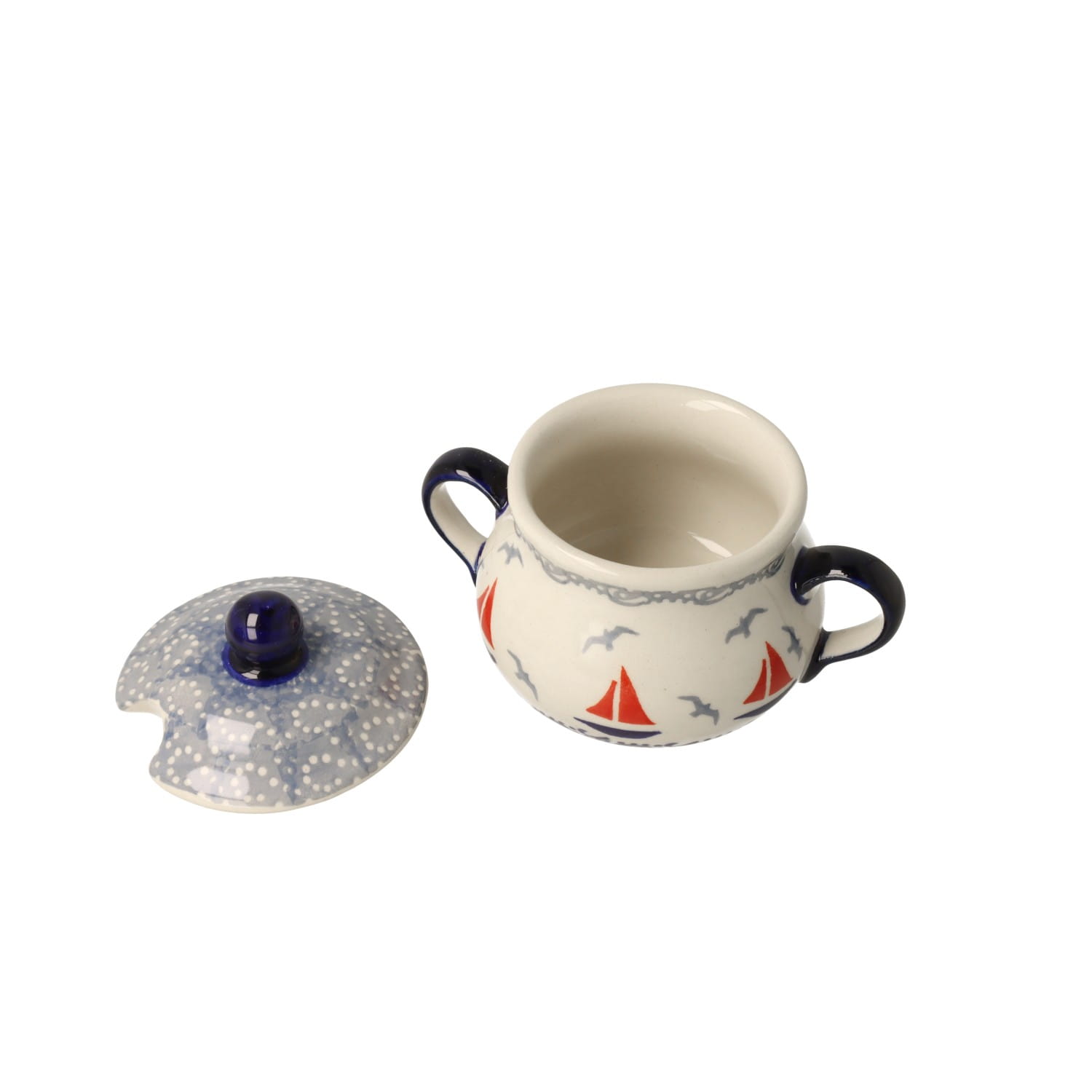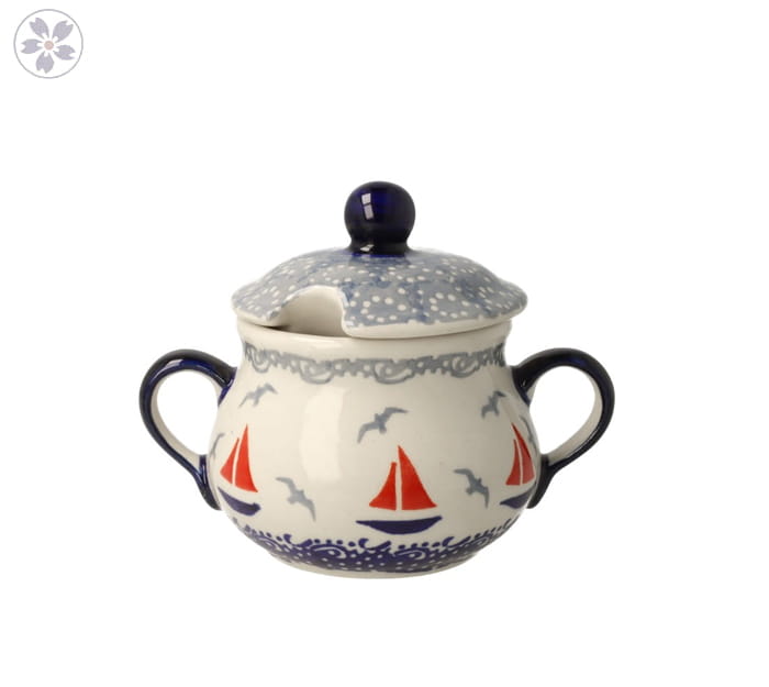 Mała cukiernica z motywem morskim, z dwoma uszkami. Pokrywka cukiernicy posiada otwór na łyżkę oraz wygodny uchwyt.