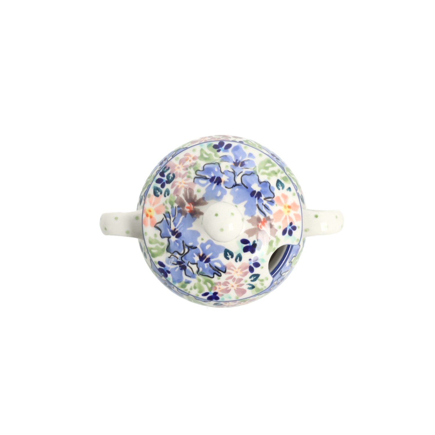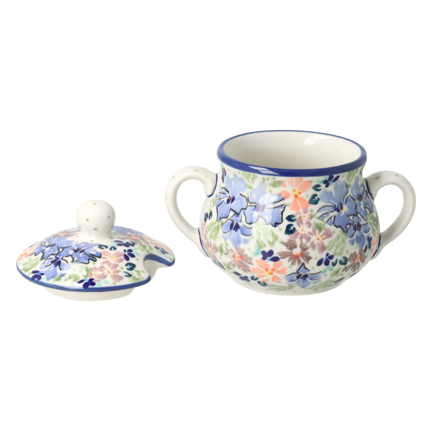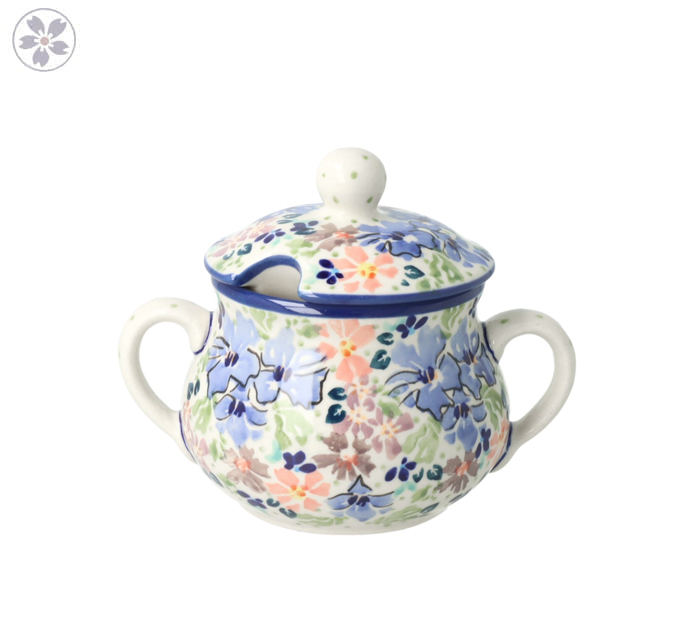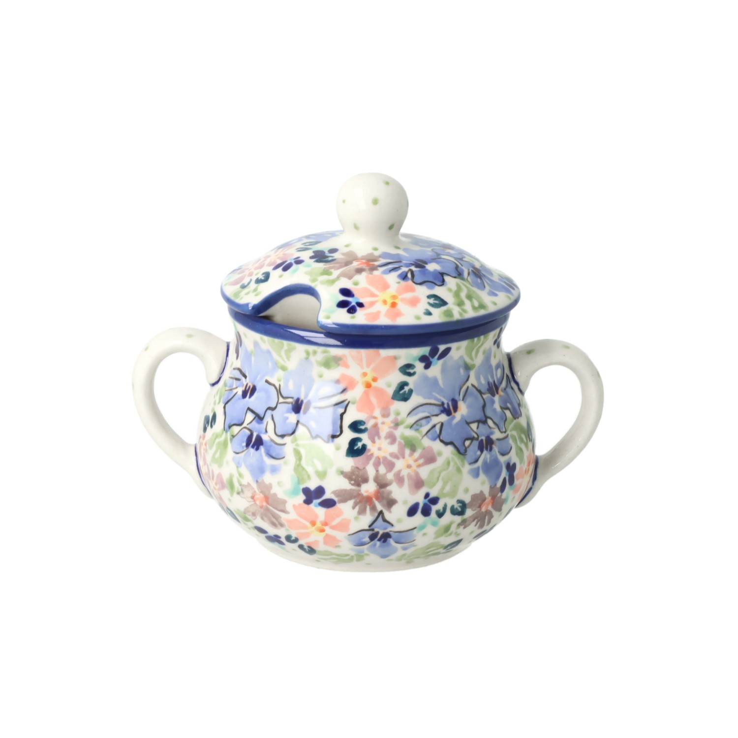 Mała cukiernica z motywem kwiatowym, z dwoma uszkami. Pokrywka cukiernicy posiada otwór na łyżkę oraz wygodny uchwyt.