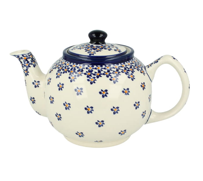 Duży czajnik z wbudowanym sitkiem. Produkt ręcznie formowany i dekorowany w Zakładach Ceramicznych Bolesławiec.