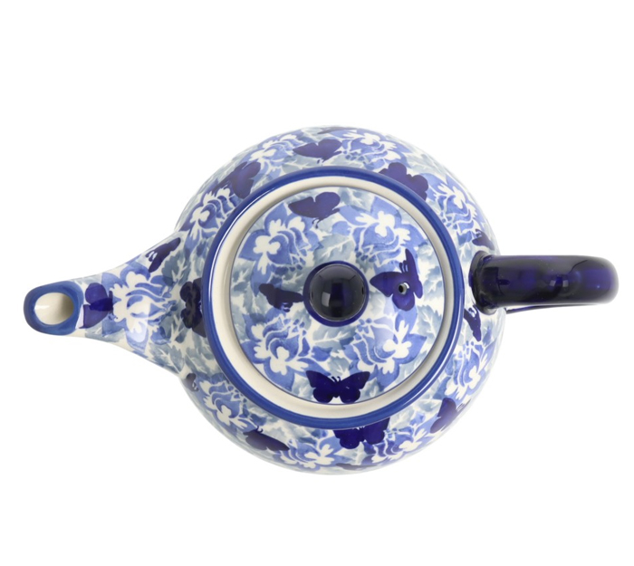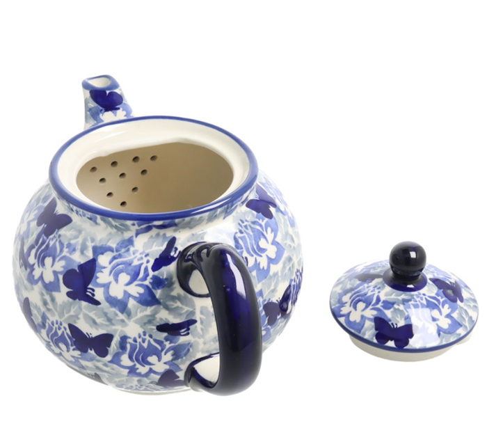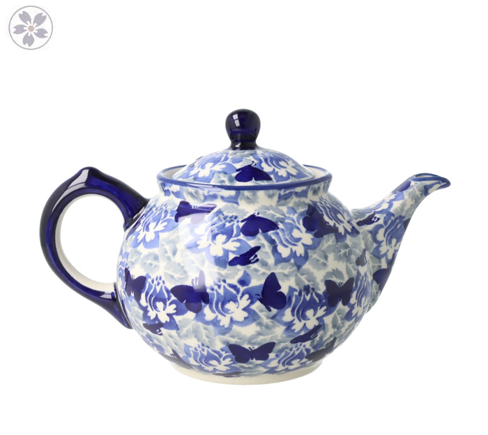 Czajnik z pokrywką i uchem z motywem kwiatów i motyli.