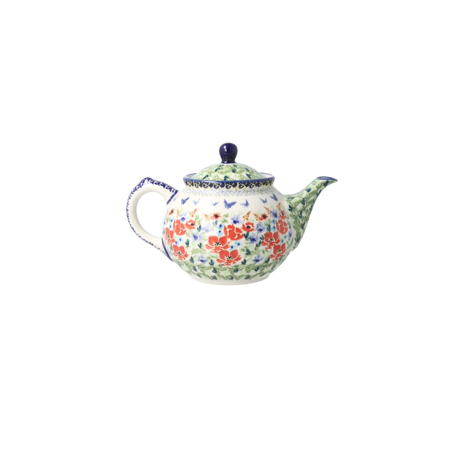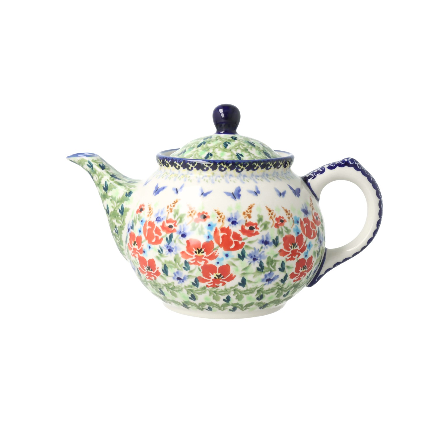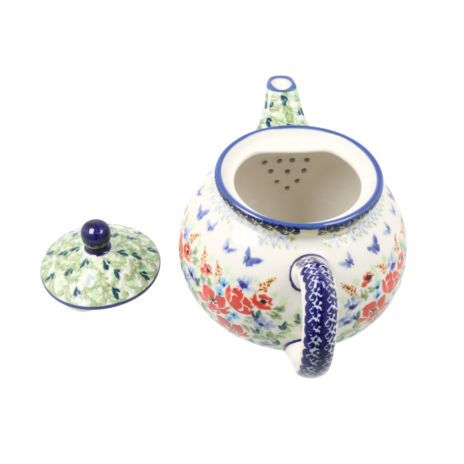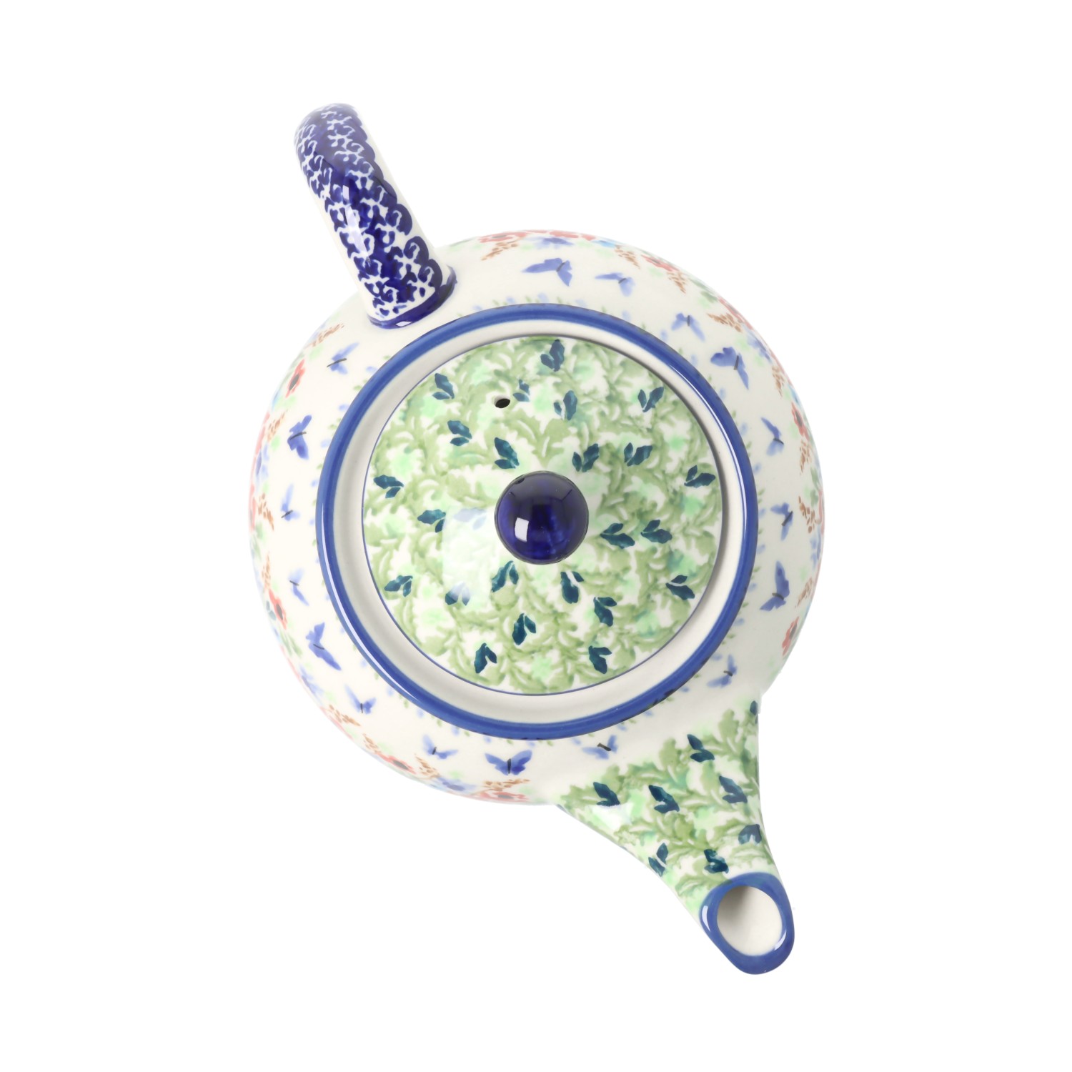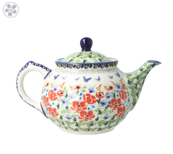 Czajnik z pokrywką i uchem z motywem kwiatów i motyli.