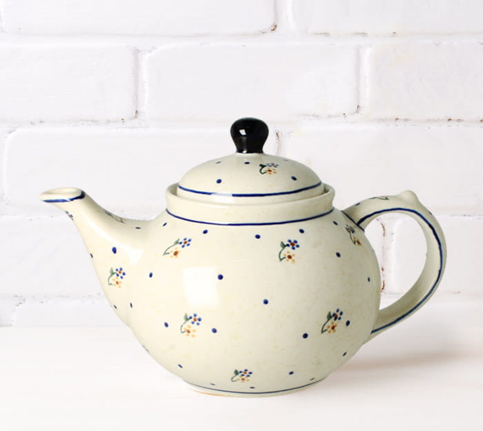 Duży czajnik z wbudowanym sitkiem. Produkt ręcznie formowany i dekorowany w Zakładach Ceramicznych Bolesławiec.