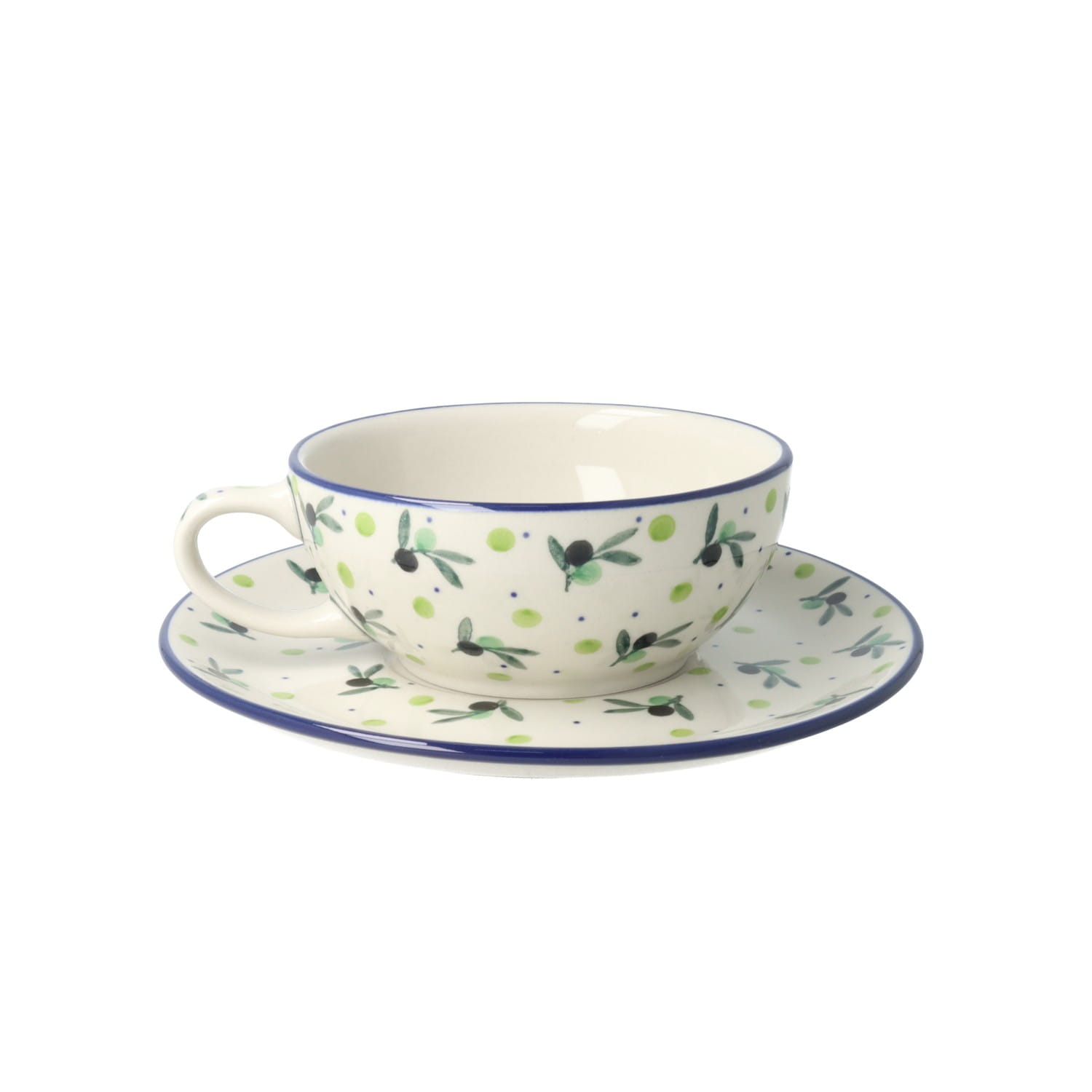 Filiżanka ze spodkiem, do herbaty. Produkt ręcznie formowany i dekorowany w Ceramice Artystycznej S.R.A. Bolesławiec.