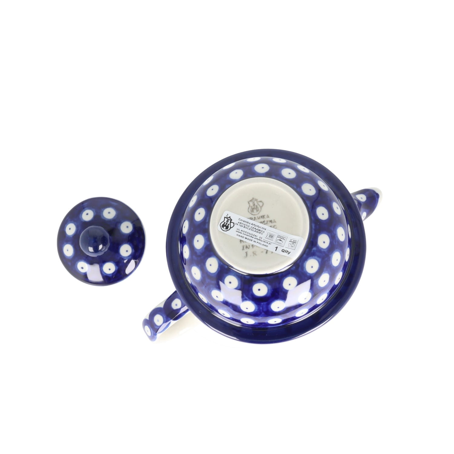 Cukiernica z uszkami i otworem na łyżeczkę. Produkt ręcznie formowany i dekorowany w Ceramice Artystycznej S.R.A. Bolesławiec.