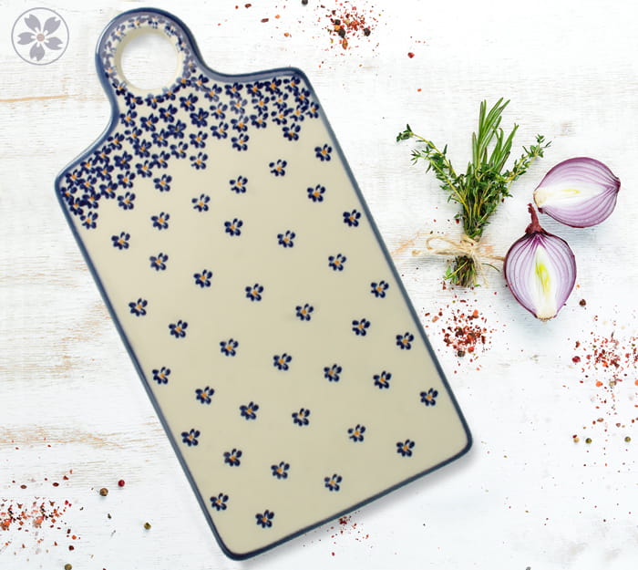 Prostokątna deska do krojenia z uchwytem. Produkt ręcznie formowany i dekorowany w Zakładach Ceramicznych Bolesławiec.