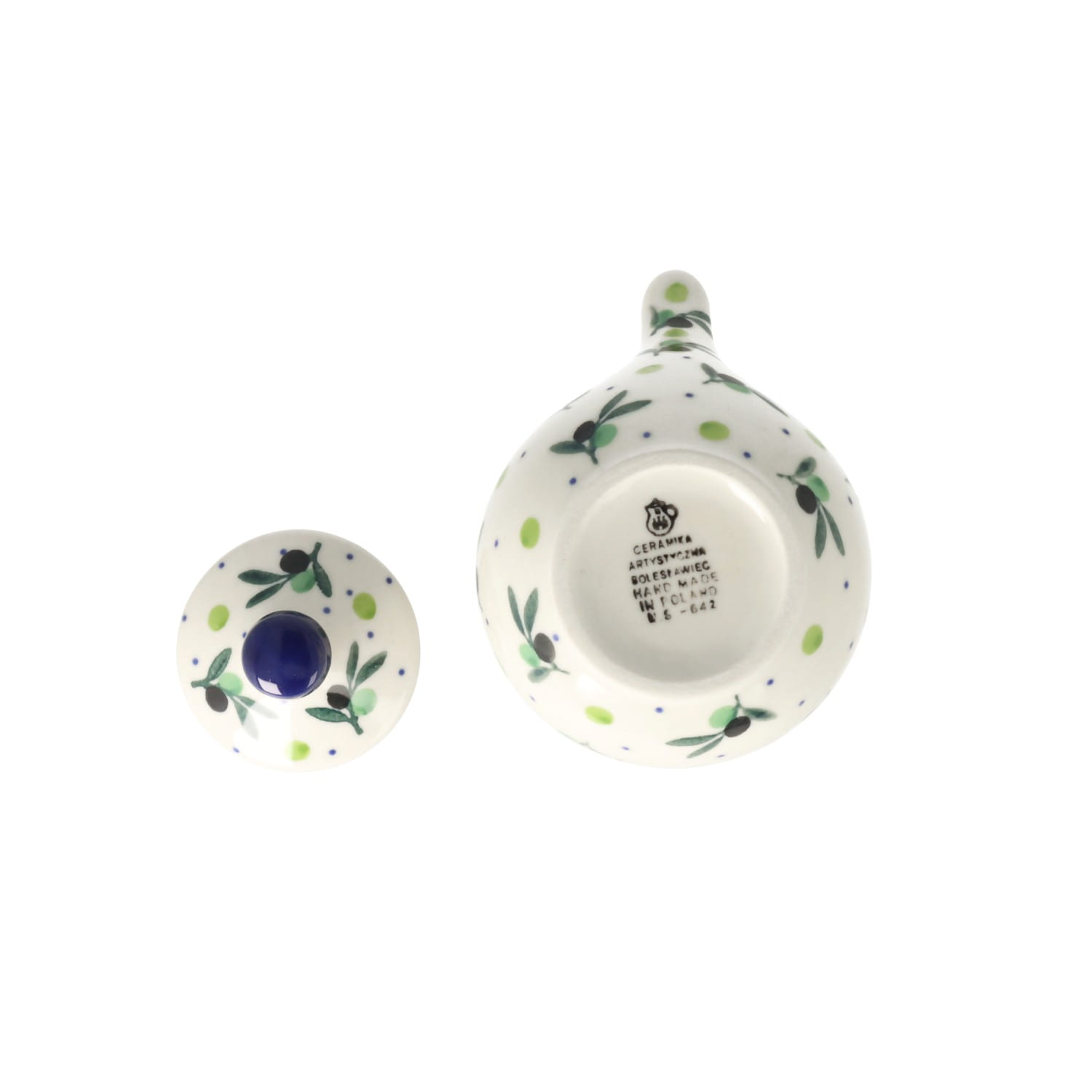 Cukiernica z uszkami i otworem na łyżeczkę. Produkt ręcznie formowany i dekorowany w Ceramice Artystycznej S.R.A. Bolesławiec.