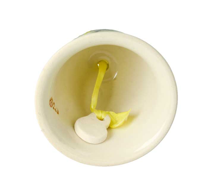 Serce dzwonka jest przywiązane za barwną wstążką. Dzięki uchwytowi dzwonek może być powieszony na choince lub na stroiku.