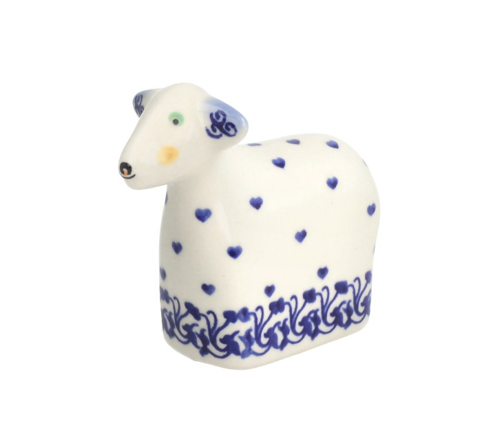 Ceramiczna figurka w kształcie baranka. Produkt ręcznie formowany i dekorowany w Zakładach Ceramicznych Bolesławiec.