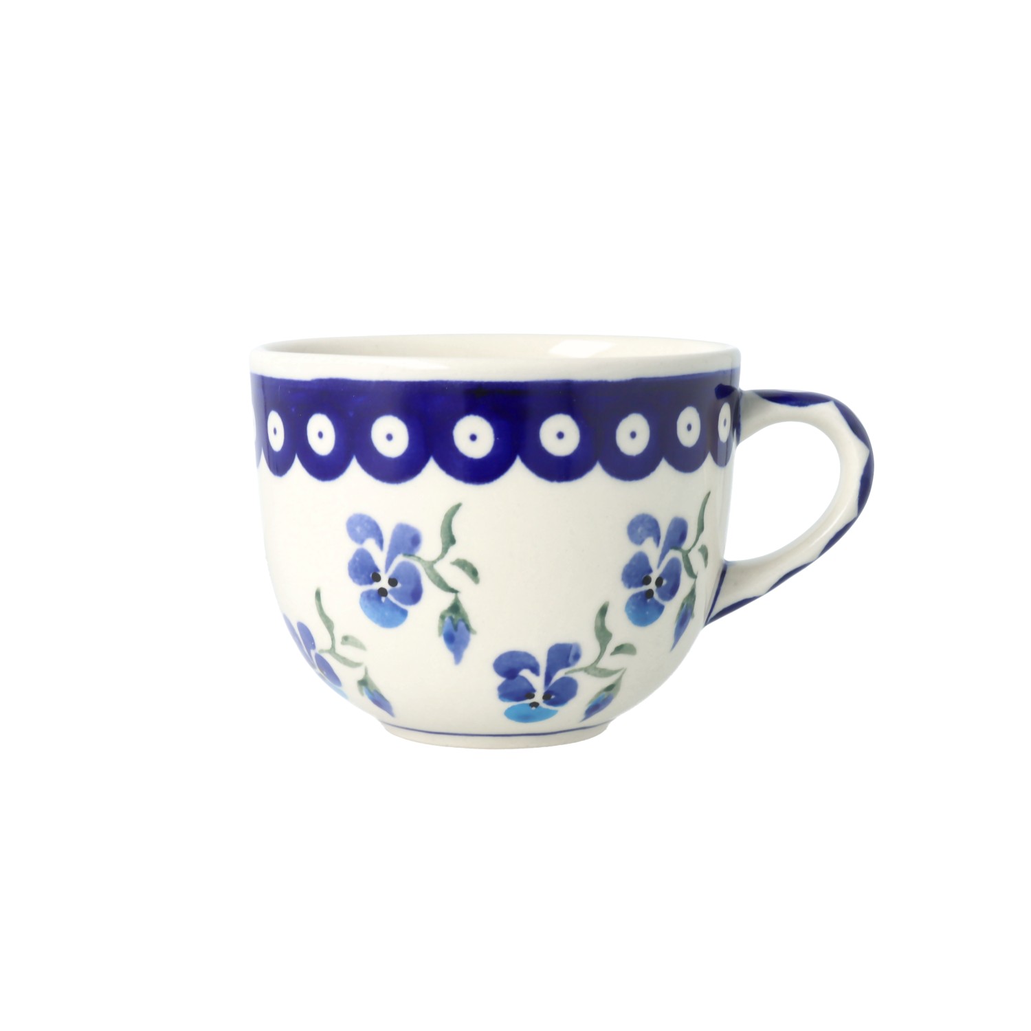 Filiżanka z uchem, w klsycznym kształcie. Produkt ręcznie formowany i dekorowany w Zakładach Ceramicznych Bolesławiec.