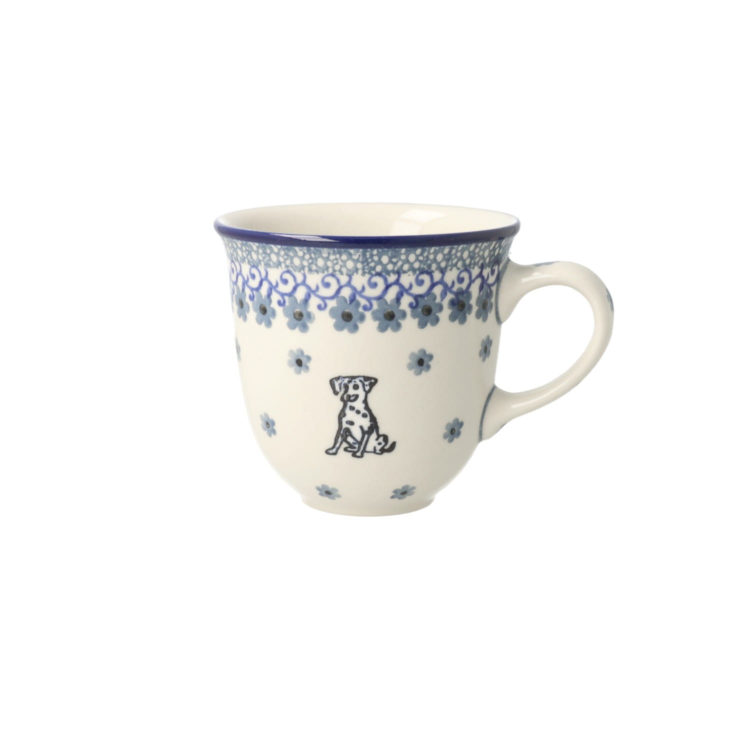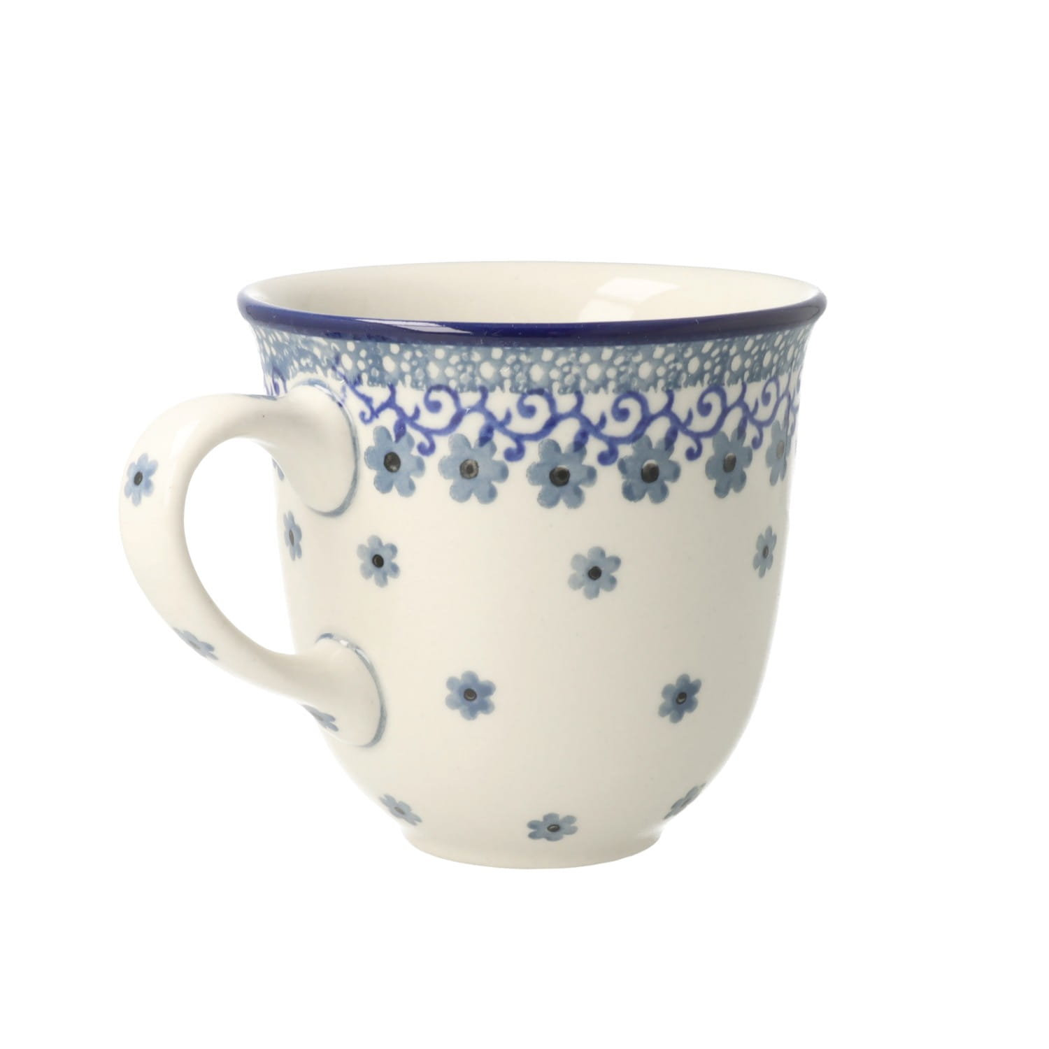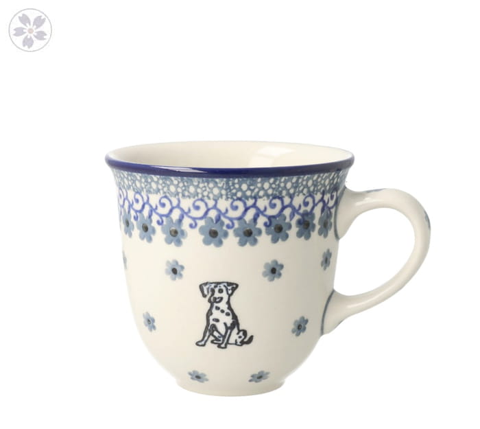 Klasyczny kubek z profilowanym uchem. Produkt ręcznie formowany i dekorowany w Ceramice Artystycznej S.R.A. Bolesławiec.