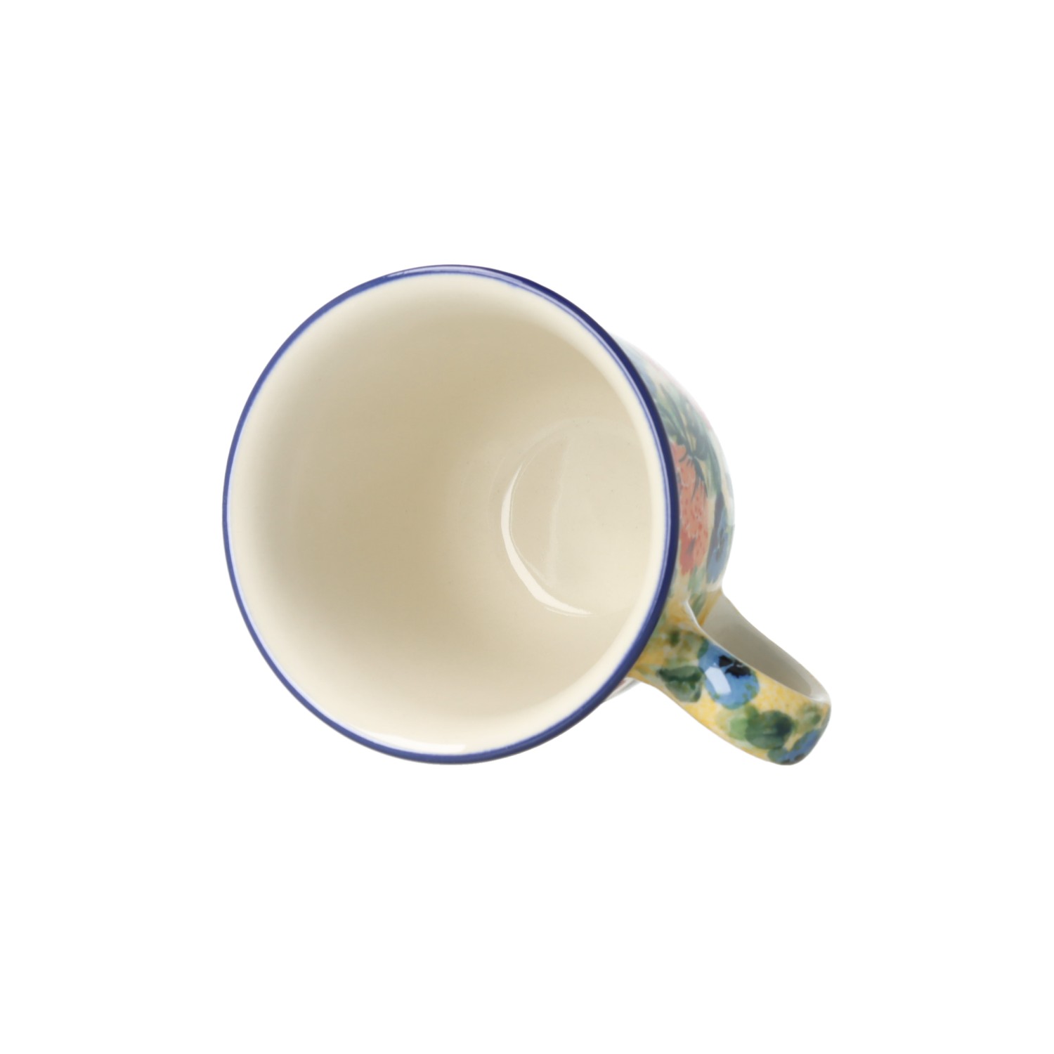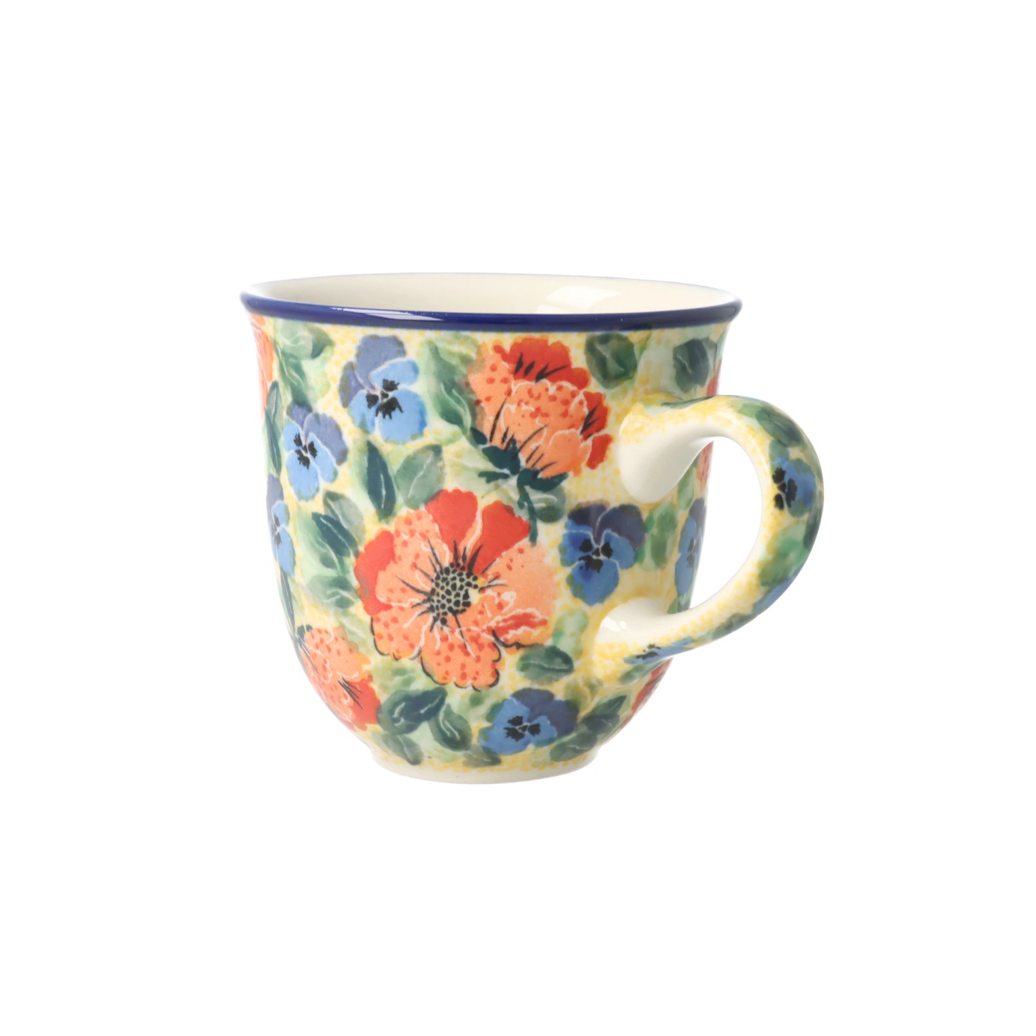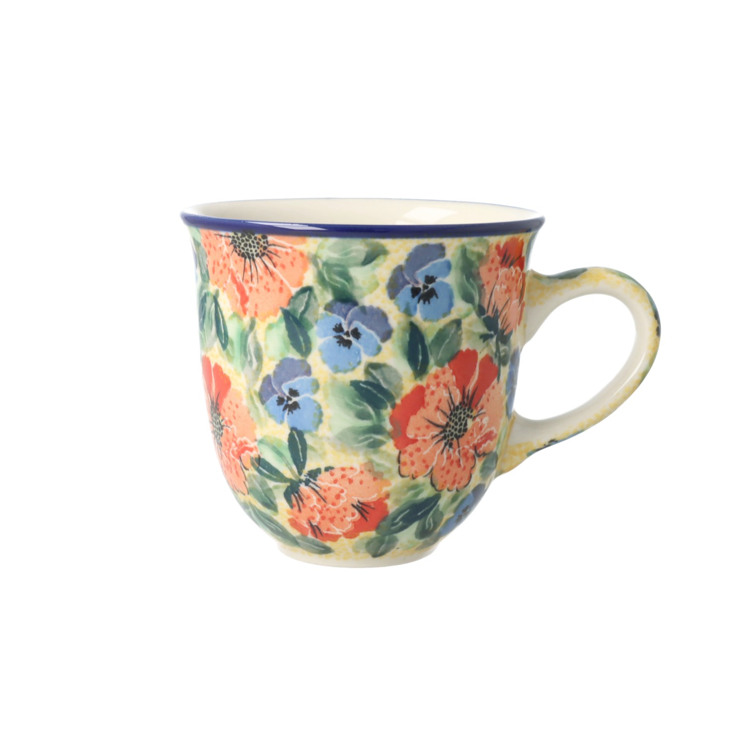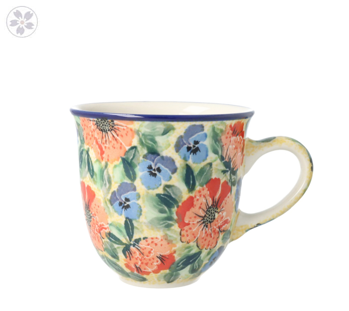 Kubek z profilowanym uchem. Produkt ręcznie formowany i dekorowany w Ceramice Artystycznej S.R.A. Bolesławiec.