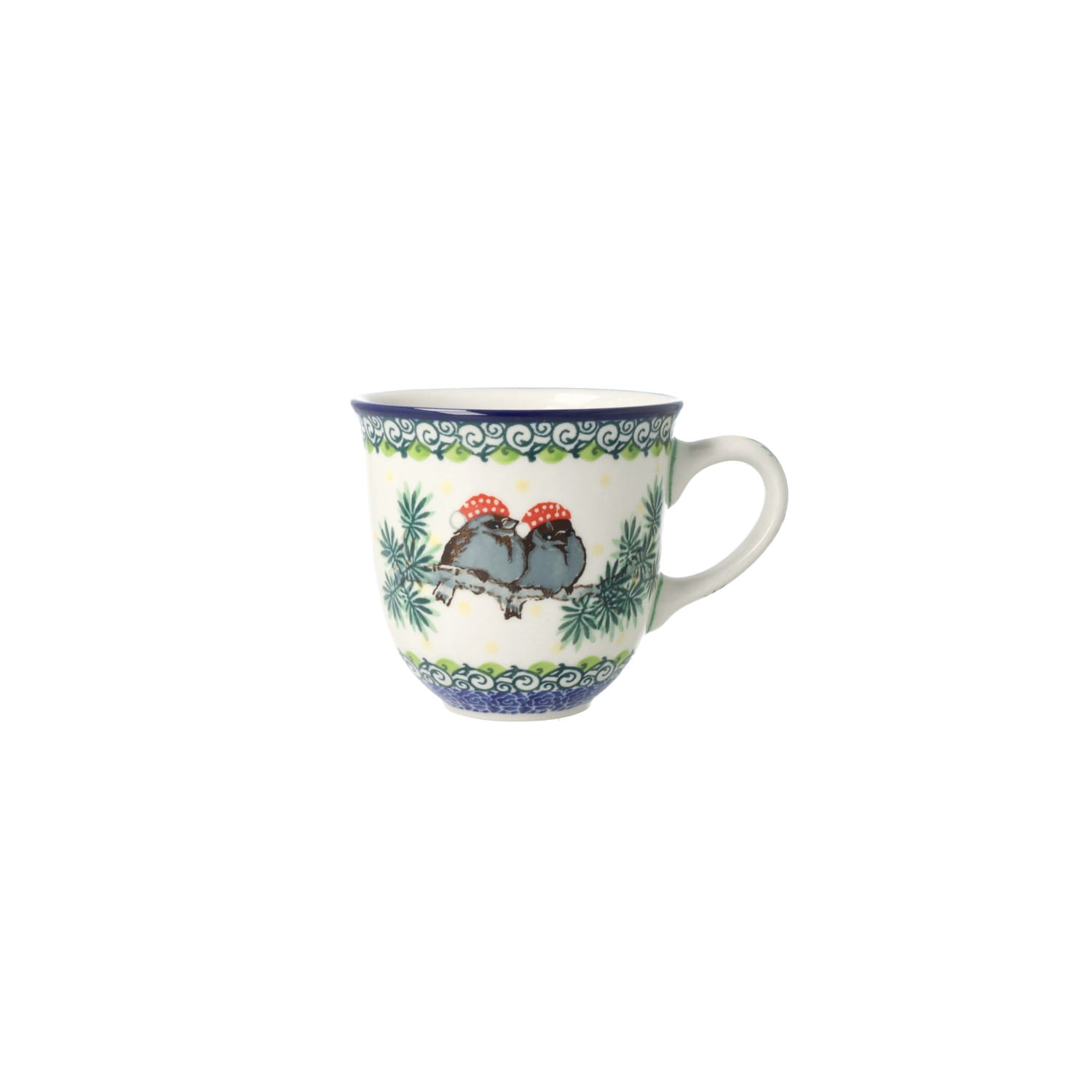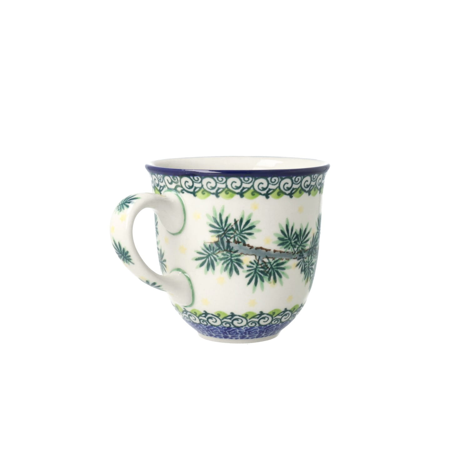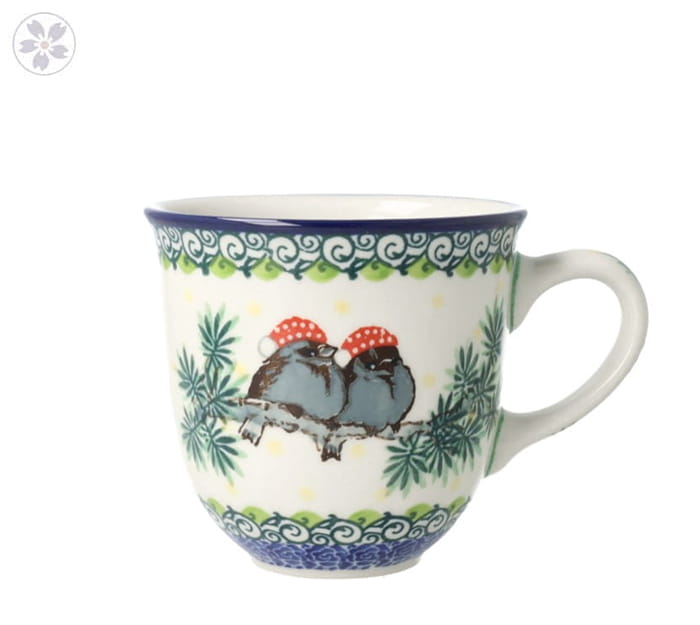 Klasyczny kubek z profilowanym uchem. Produkt ręcznie formowany i dekorowany w Ceramice Artystycznej S.R.A. Bolesławiec.